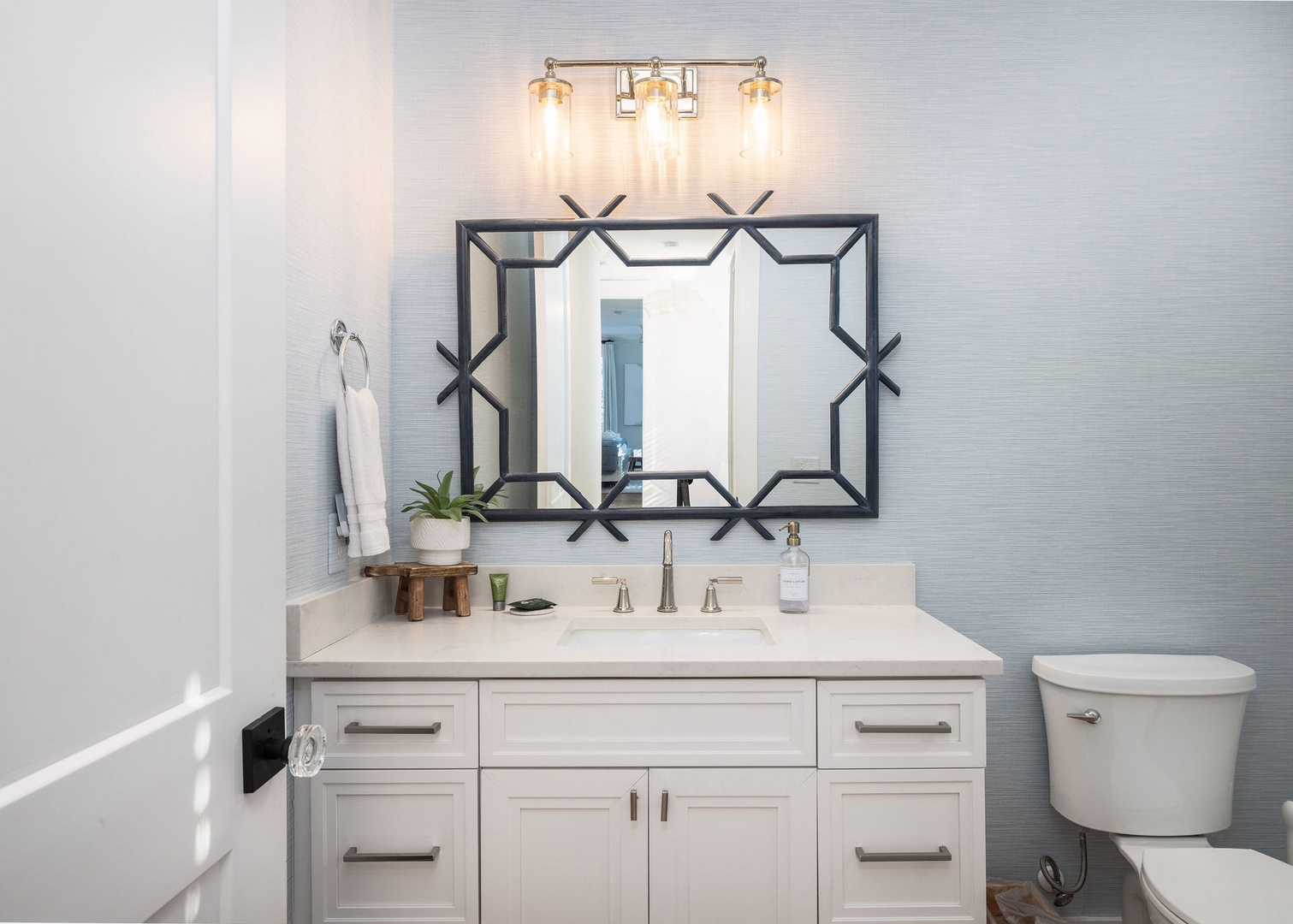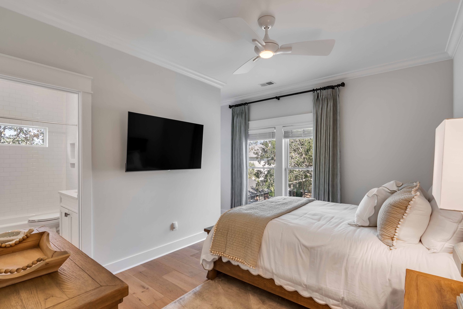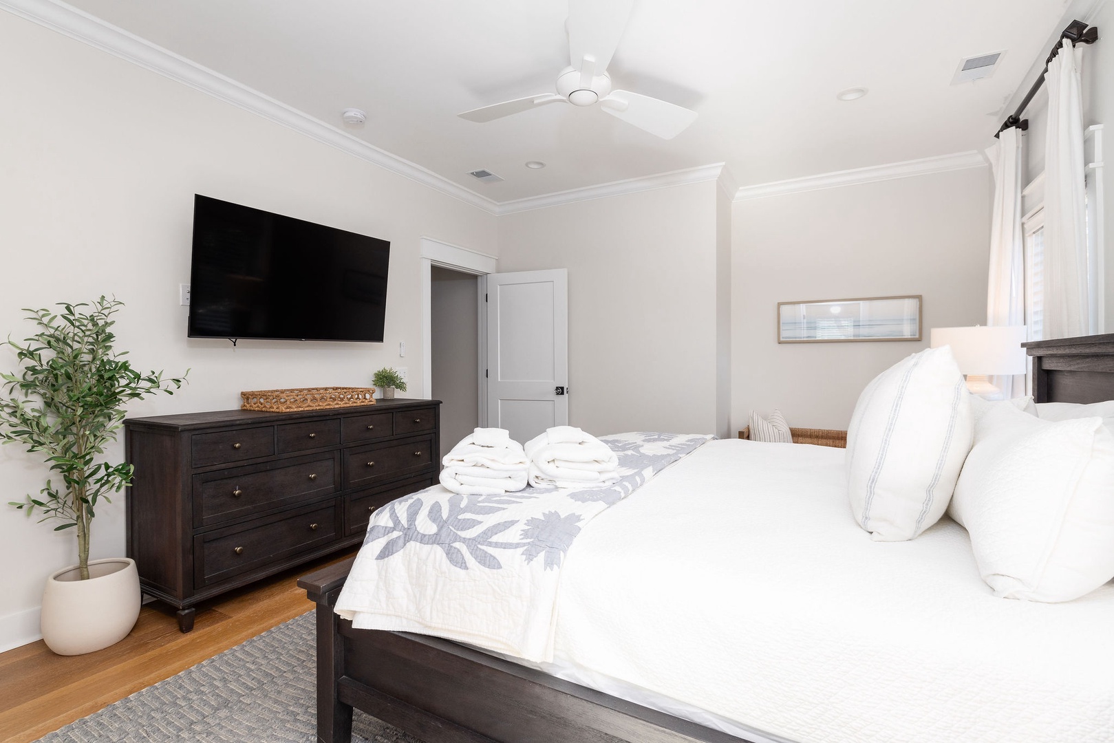 Inviting modern coastal bedroom with a queen bed and smart TV and private ensuite bath