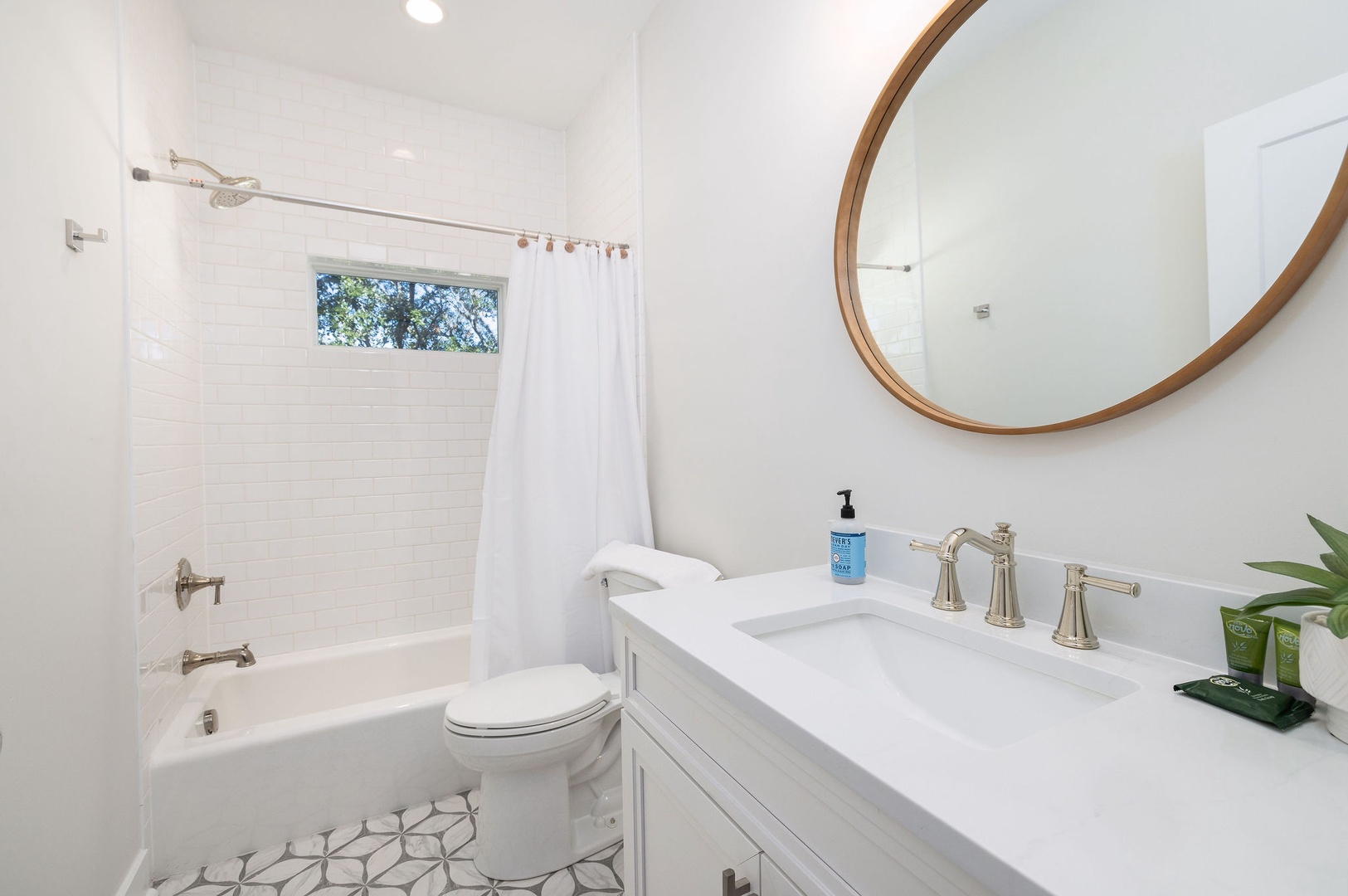 Modern bathrooms with walk-in showers and luxurious soaking tubs. Fresh towels and complimentary toiletries provided.
