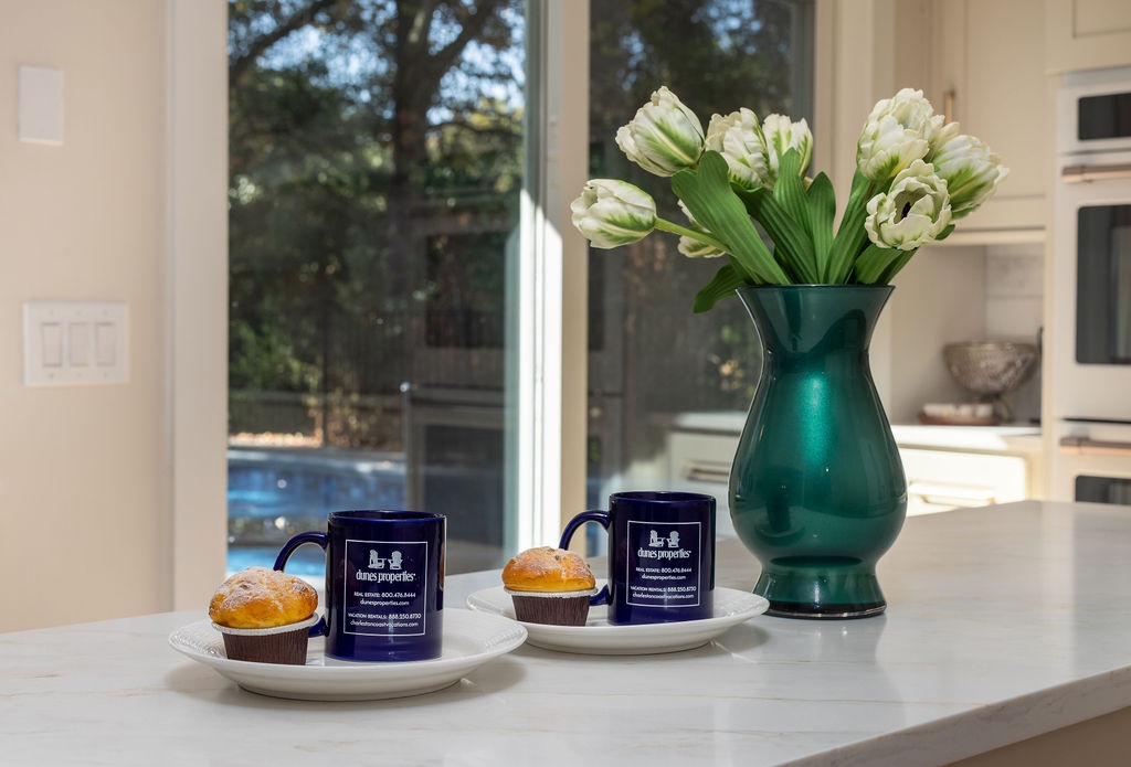 The relaxing living room provides a lovely place to enjoy your friends and family. The main living room has a great view of the pool and private yard. There’s also a large TV for those rainy days, movie nights or to catch the game.
