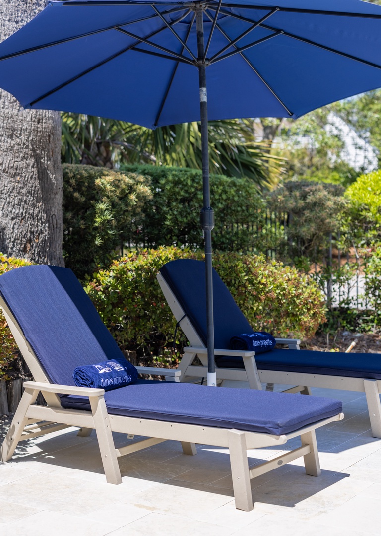 New poolside loungers with plush cushions and shady umbrellas—ideal for all-day comfort by the water.