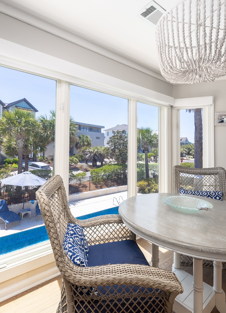 Dine outdoors under the umbrella with views of the pool and ocean breeze drifting in.