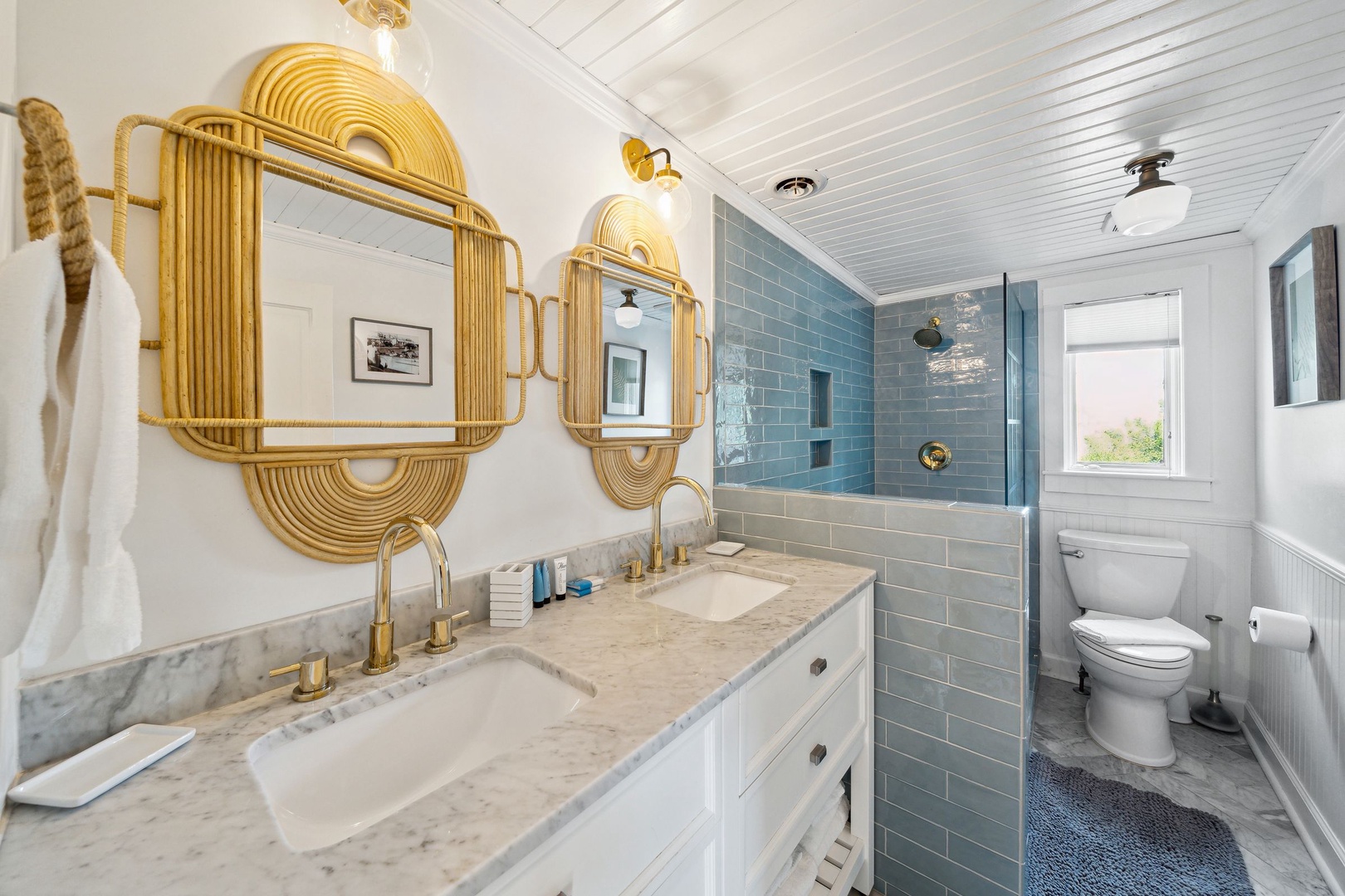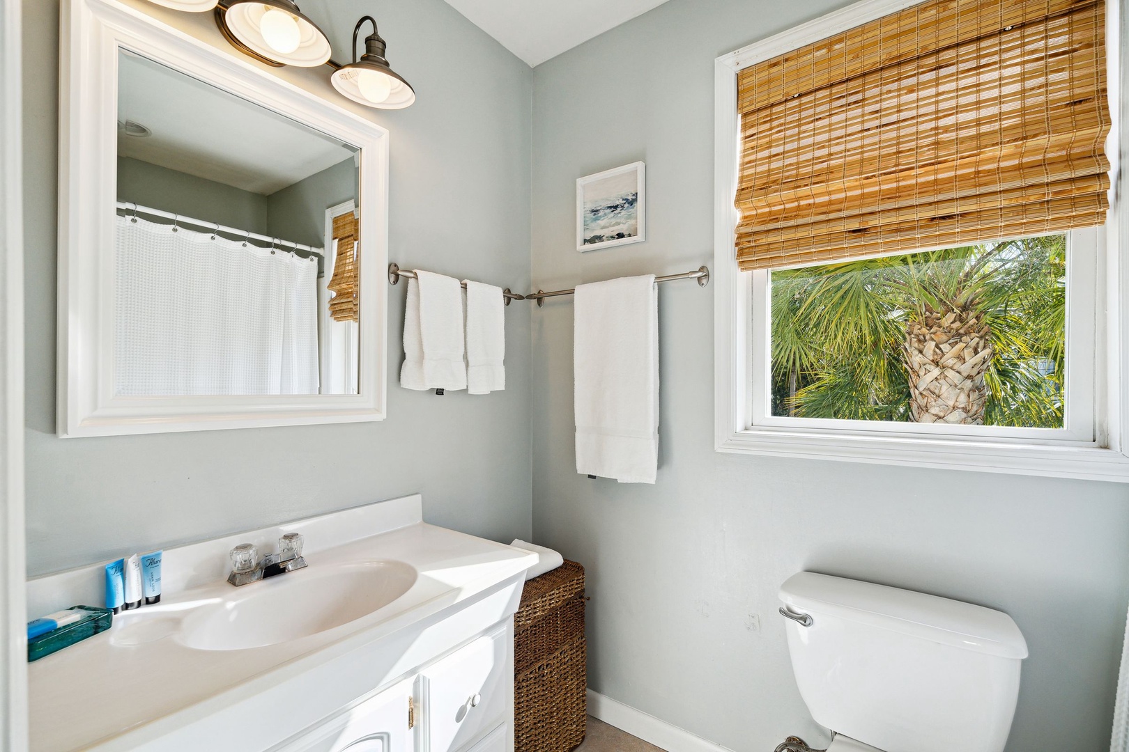 Bright coastal bedroom with a cozy queen bed, ocean-inspired décor, and sunlit views of palm trees