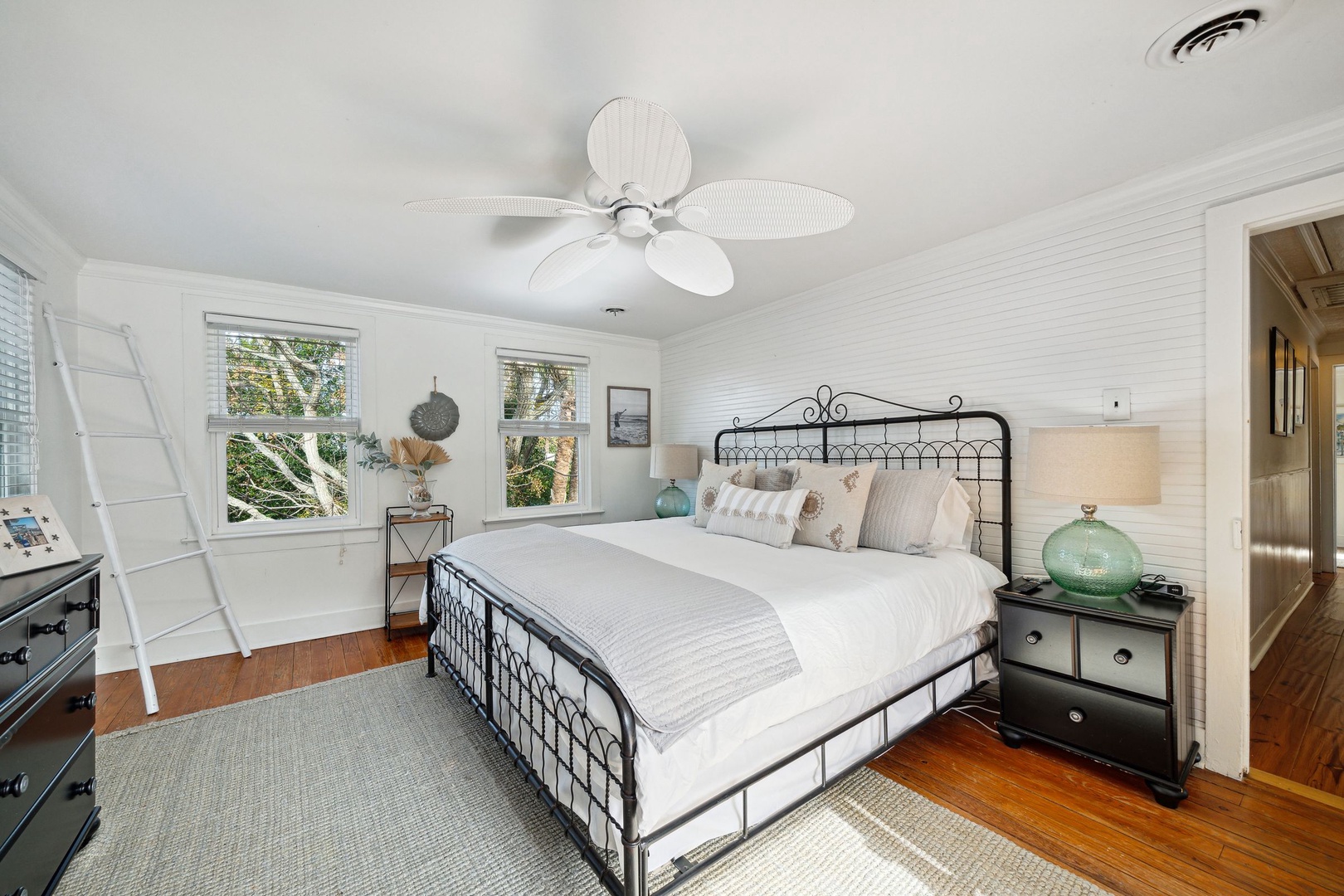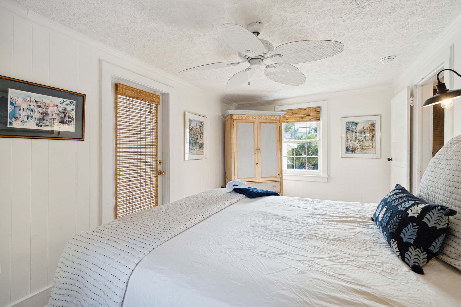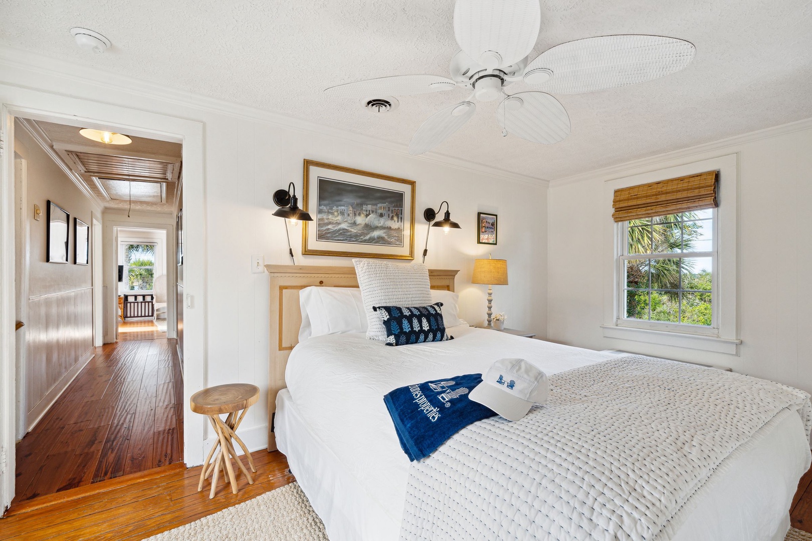 Serene coastal bedroom with a king bed, soft neutral décor, and bright natural light for a relaxing seaside stay