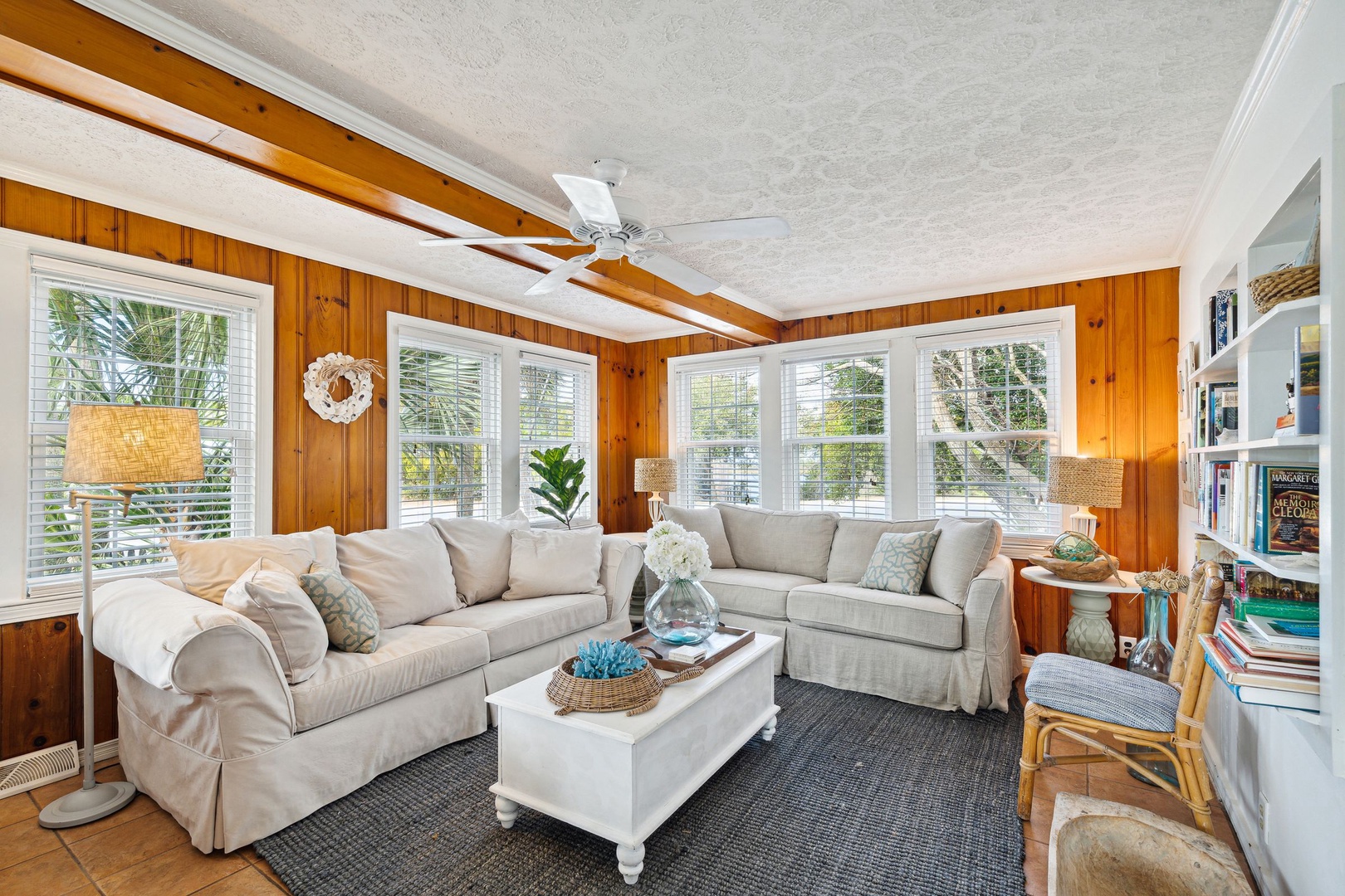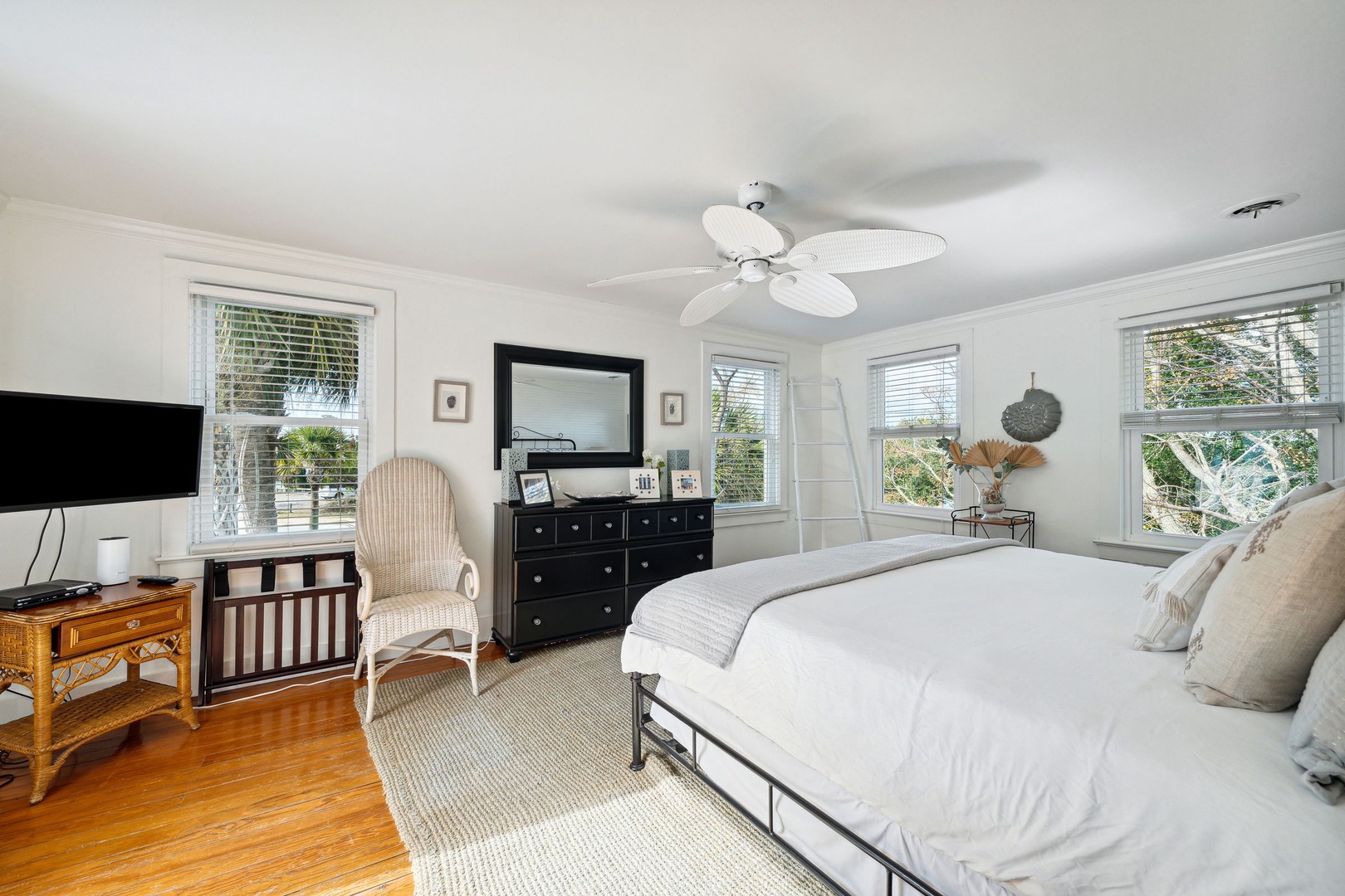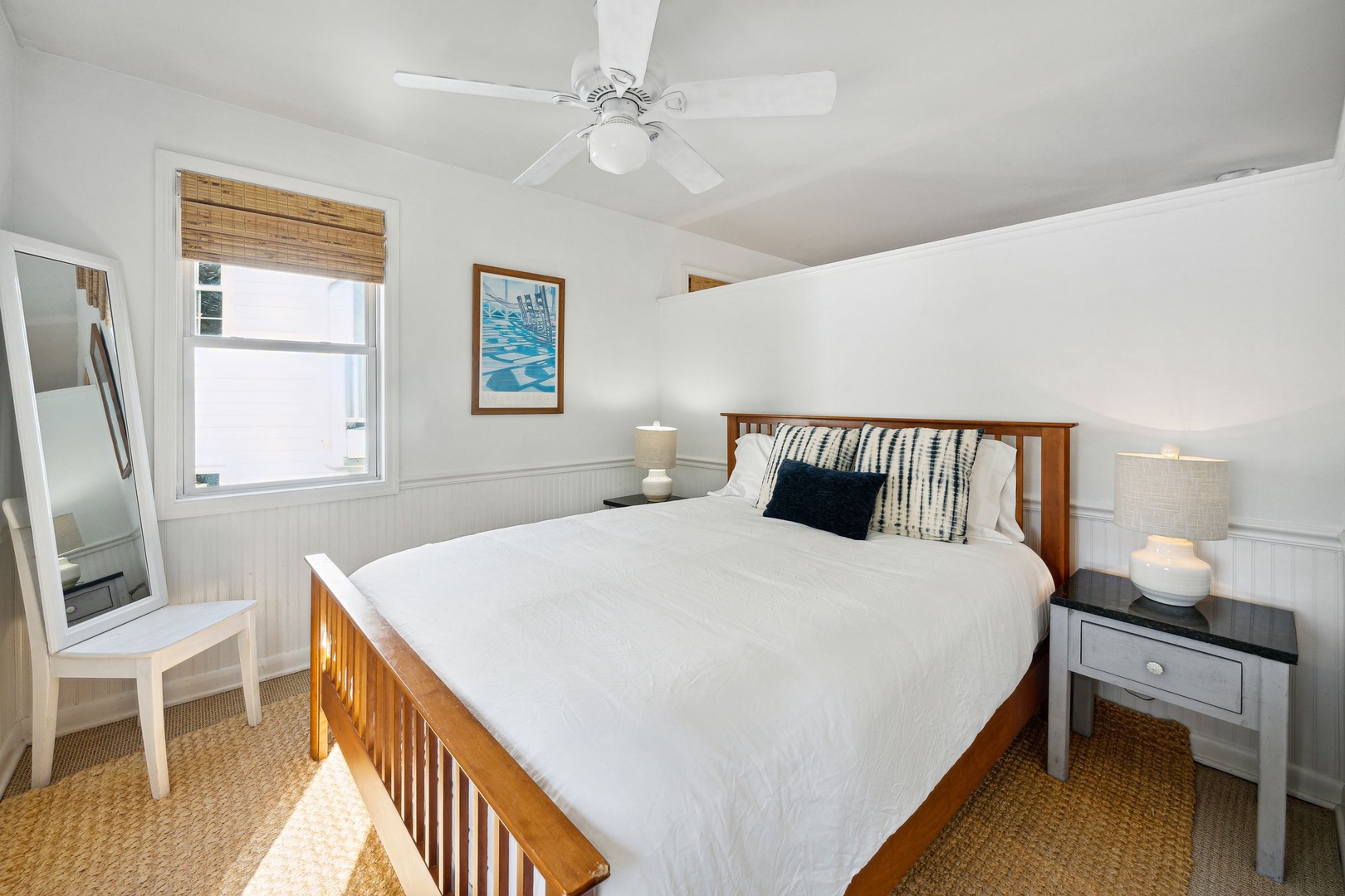 Serene coastal bedroom with a king bed, soft neutral décor, and bright natural light for a relaxing seaside stay
