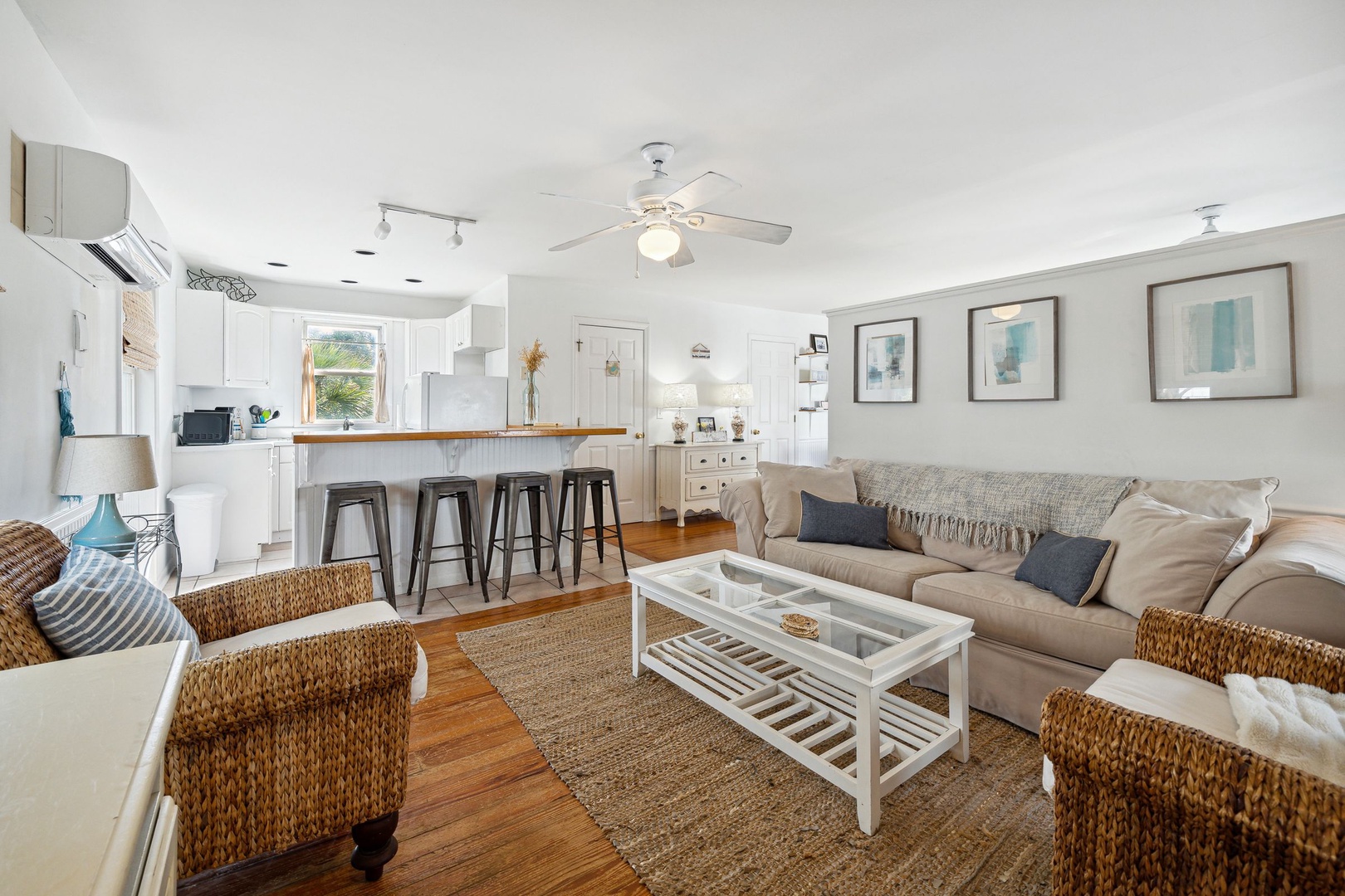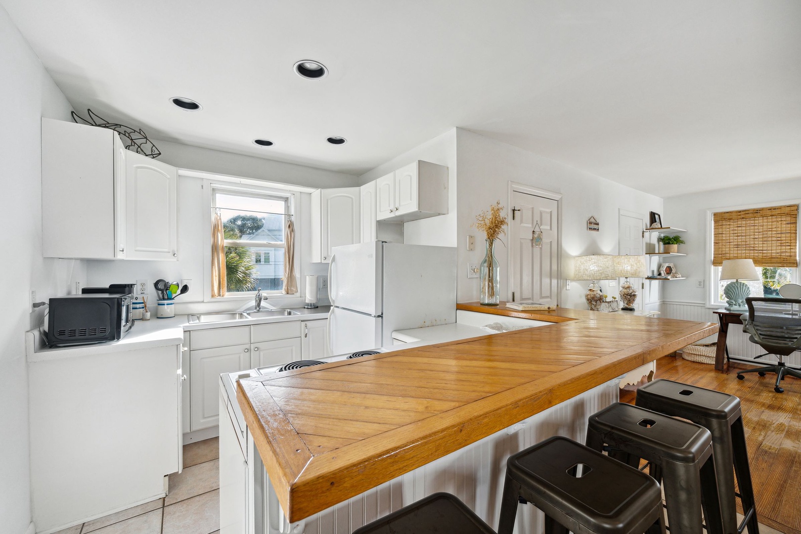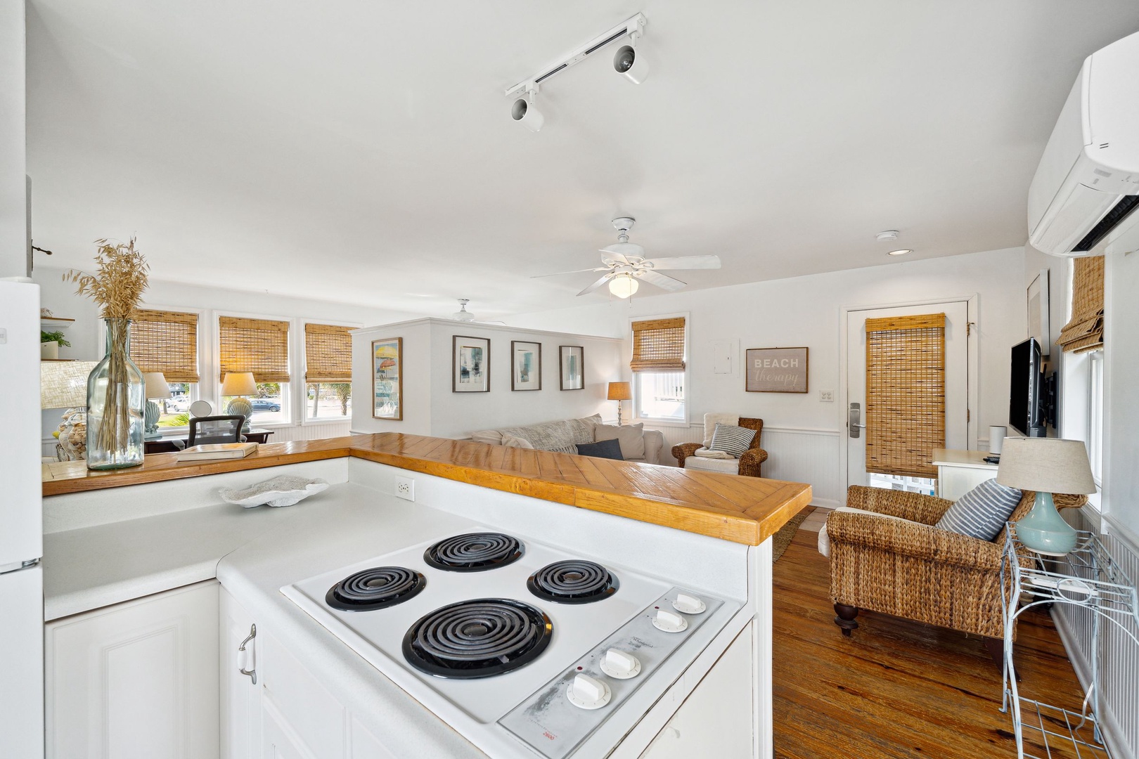 Located just two blocks from the beach, offering easy access to sand and surf.