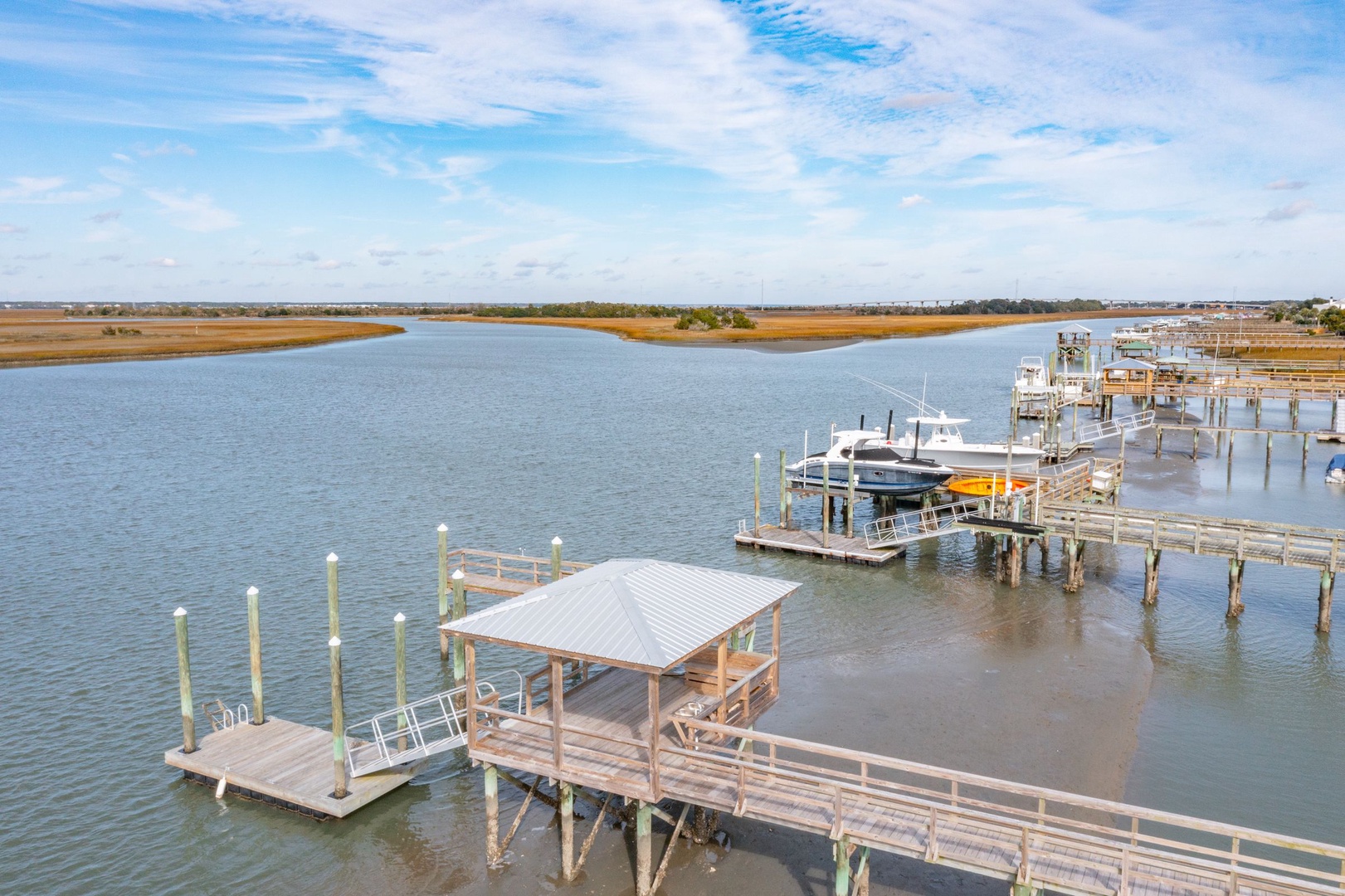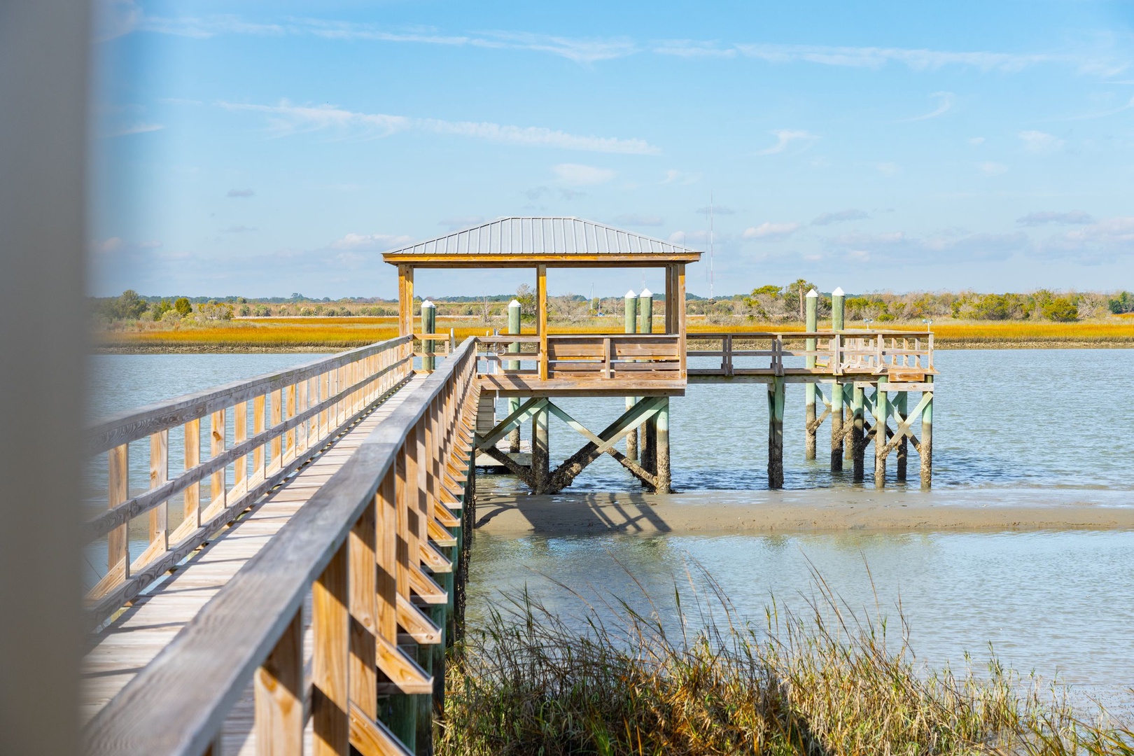 Brand-new covered dock for kayaking, swimming, fishing, or crabbing.