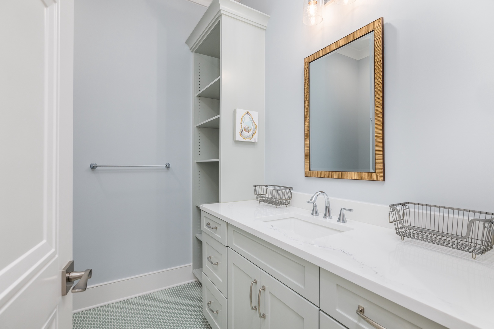 Coastal updated bathroom featuring walk-in glass shower, single vanity