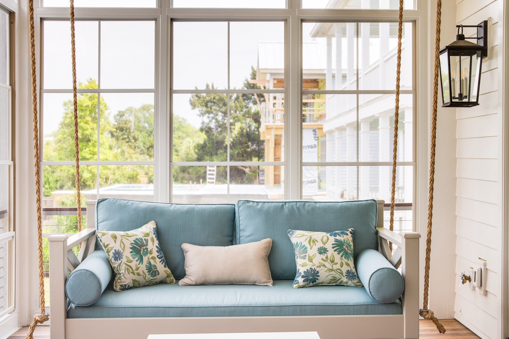Screened-in porch off the living room with a charming bed swing and Smart TV—perfect for relaxing any time of day