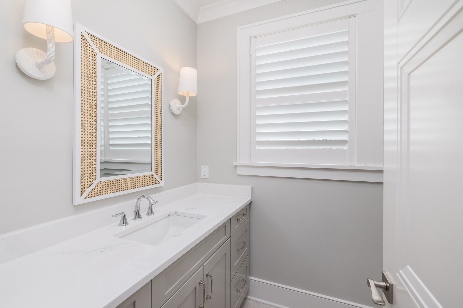 Coastal updated bathroom featuring tub-shower combo, single vanity