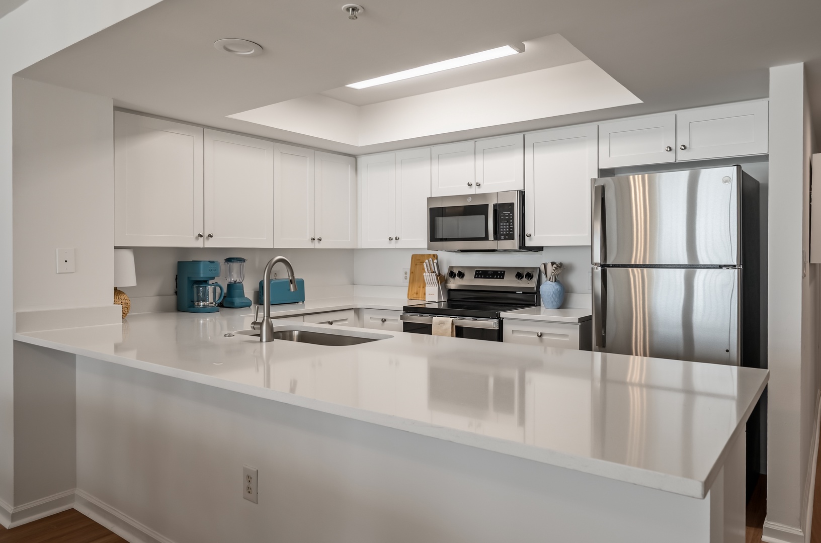 Your fully equipped kitchen features gleaming white counters, stainless steel appliances, and everything you need to prepare memorable meals during your stay.