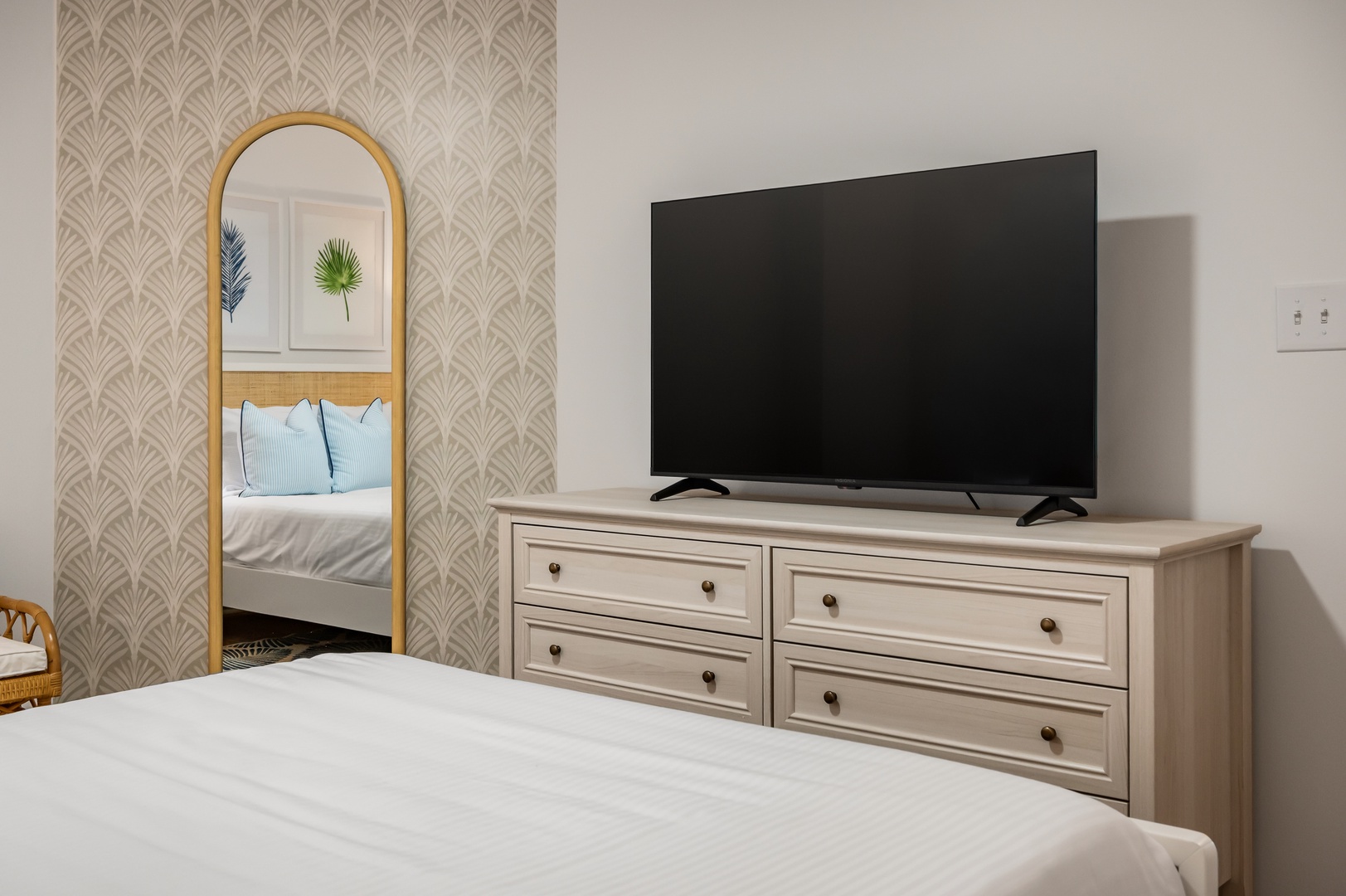 Sink into crisp linens and coastal charm in your serene bedroom retreat, where tropical artwork and ocean-inspired accents create the perfect escape.