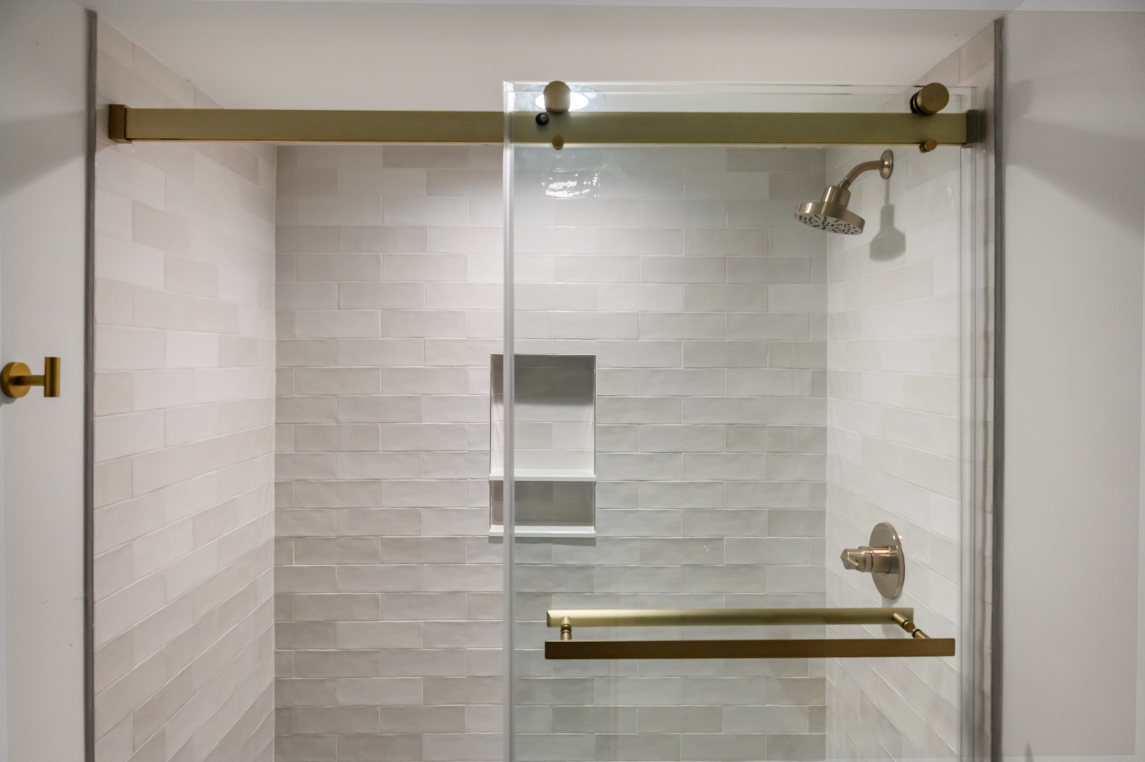Step into your private shower featuring elegant textured tiles and brass fixtures for a luxurious, spa-like experience.