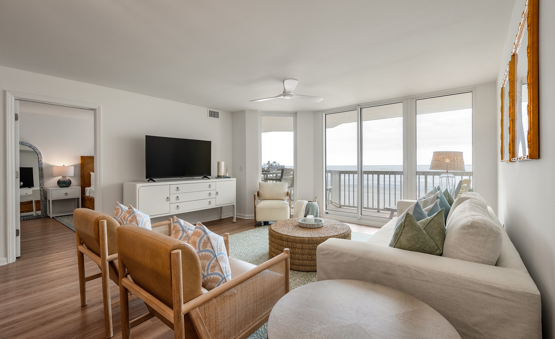 Relax in your bright, coastal-inspired living room with ocean views from your private balcony and comfortable seating for memorable evenings together.
