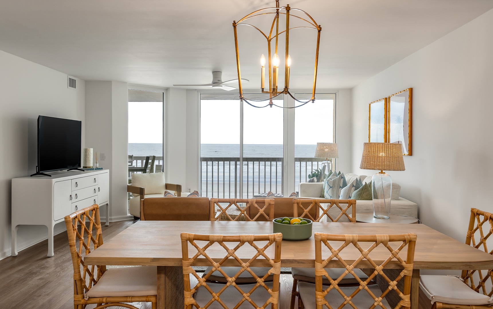 Your elegant dining space features coastal charm with bamboo chairs and sweeping ocean views through floor-to-ceiling windows.
