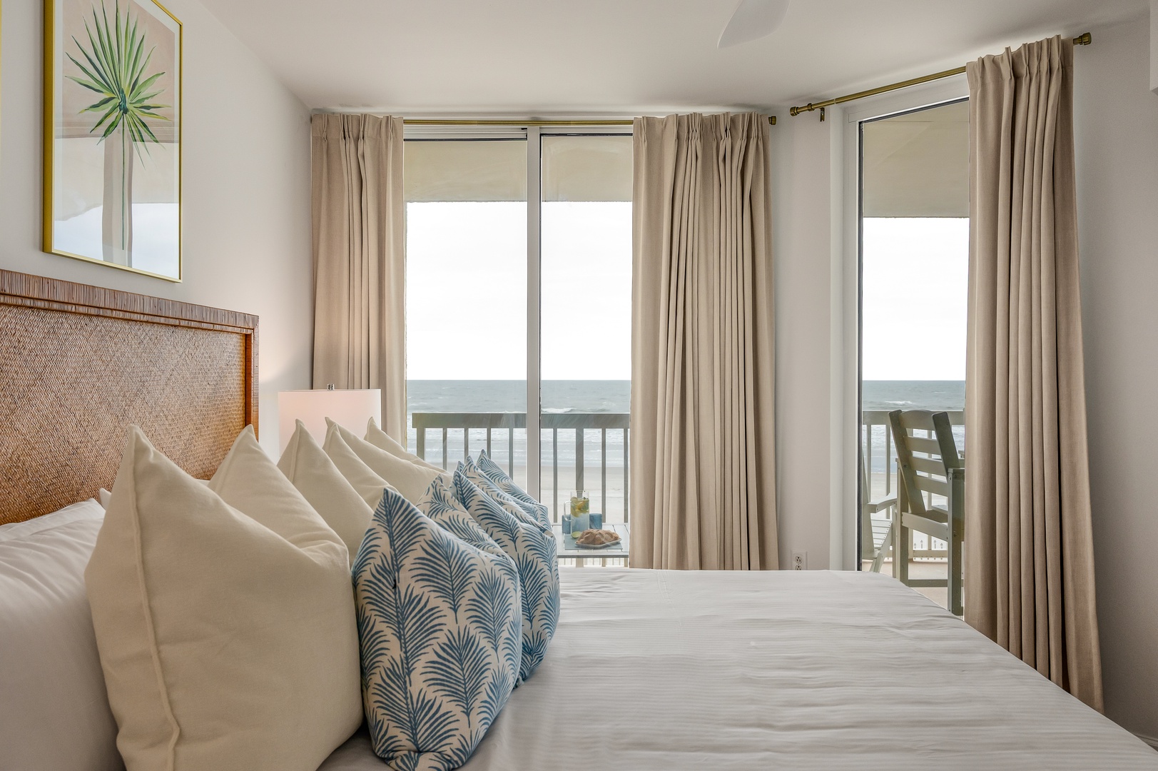 Wake up to endless ocean views from your serene bedroom, where tropical-inspired linens and a private balcony create your perfect seaside retreat.