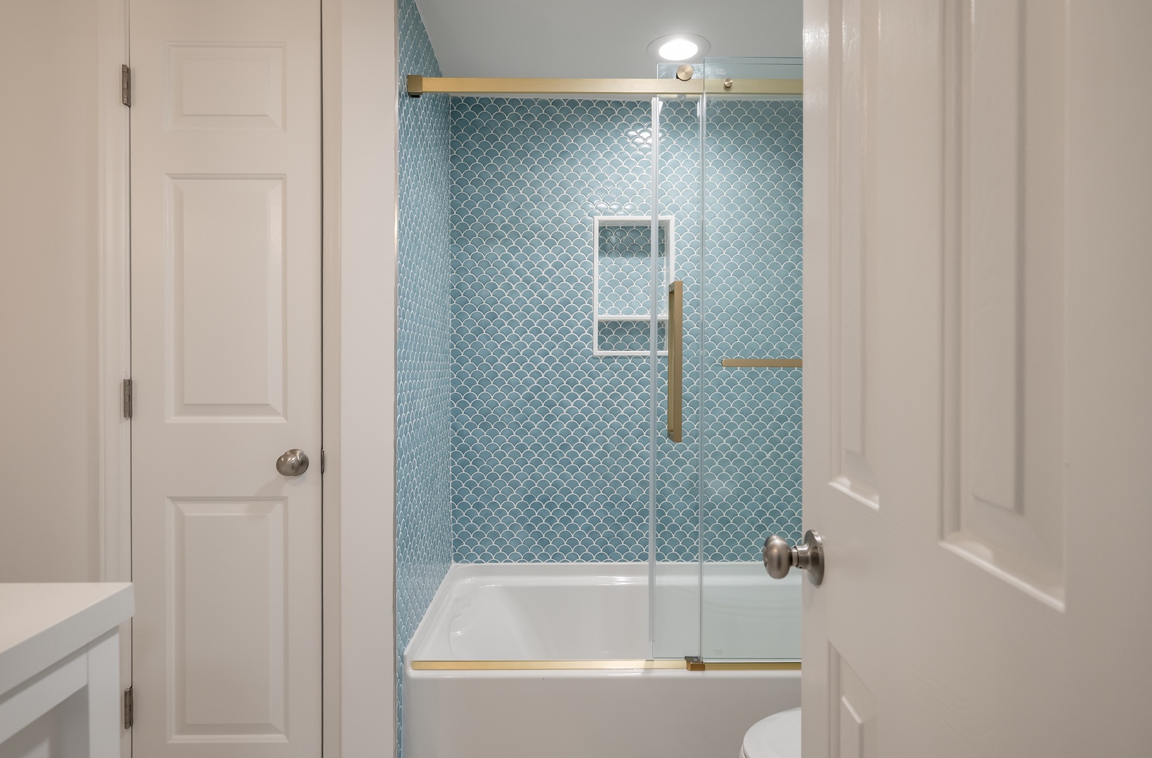 Unwind in your stylish bathroom featuring stunning turquoise tile shower, brass fixtures, and thoughtful touches that create a spa-like retreat.