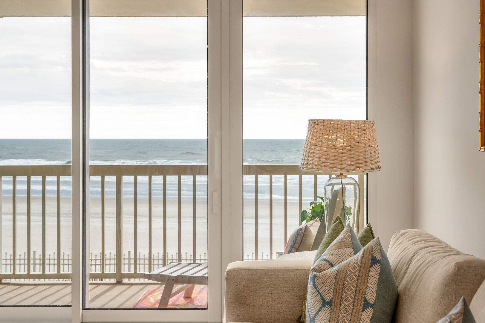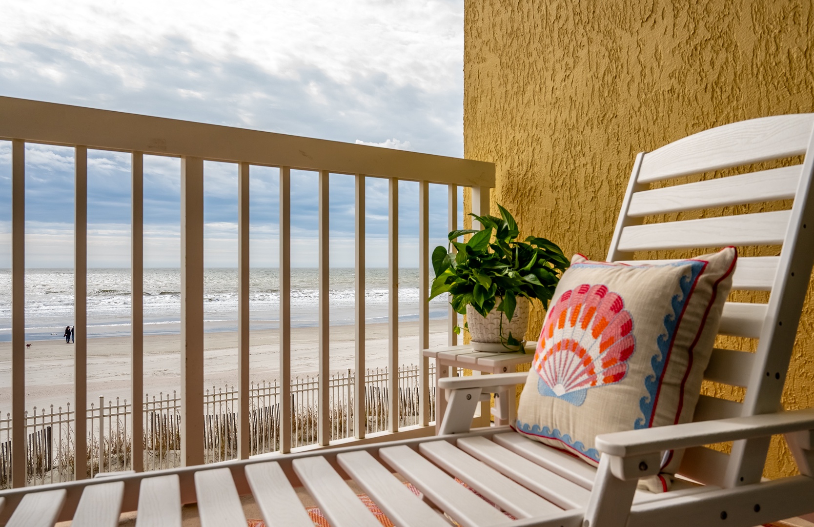 Oceanfront balcony with stunning pier views and comfortable seating for your perfect beach getaway moments.