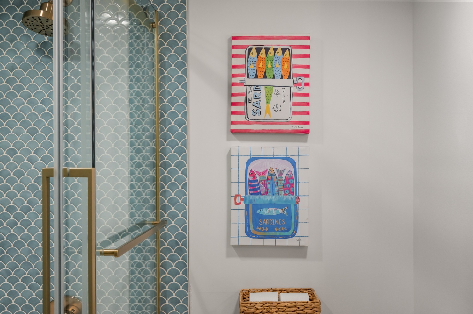 Step into your beautifully tiled bathroom featuring a stylish shower and charming coastal artwork that adds personality to your private space.