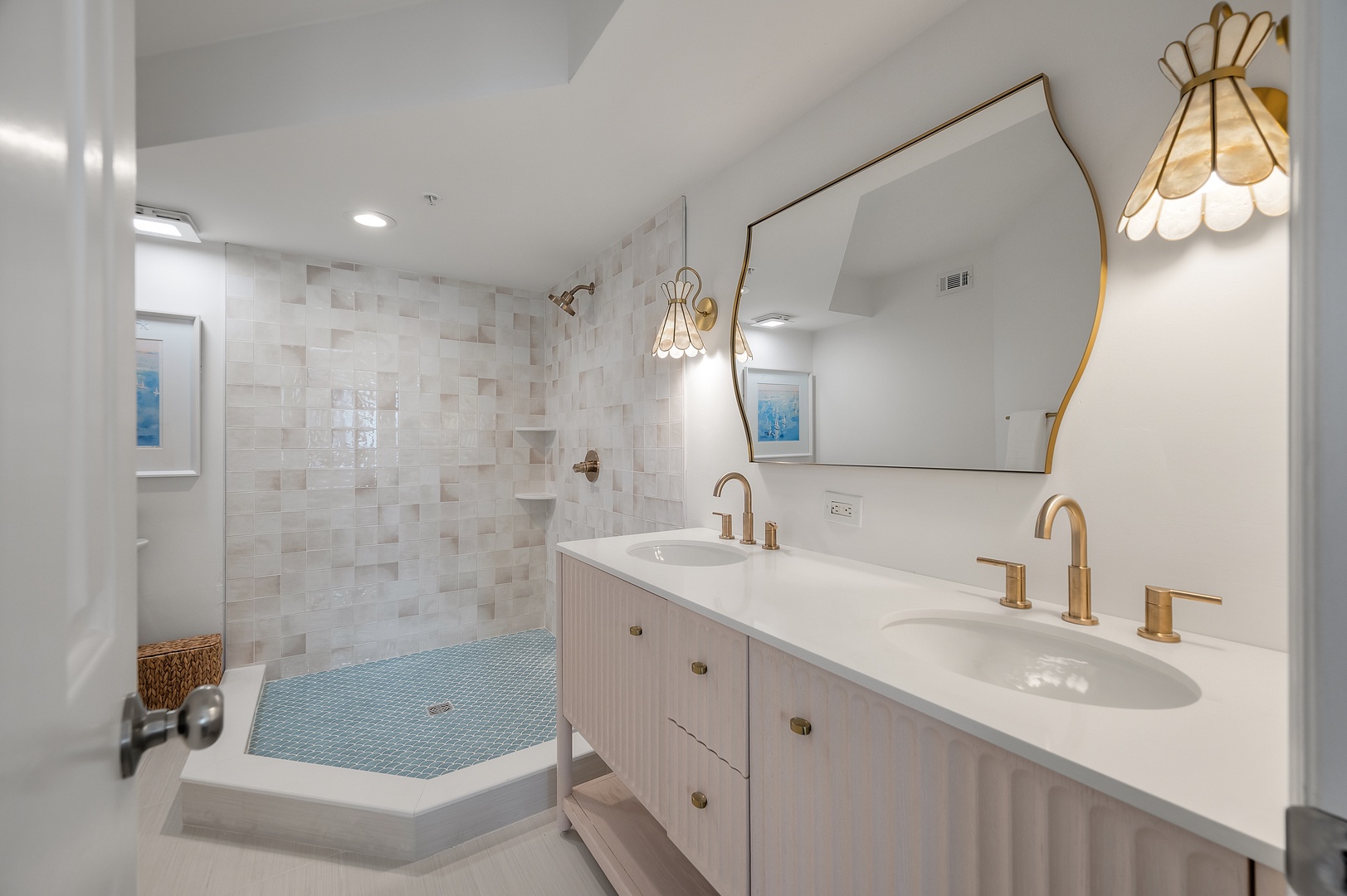 Unwind in your luxurious spa-style bathroom featuring dual vanities, elegant gold fixtures, and a stunning tiled shower with penny tile flooring.