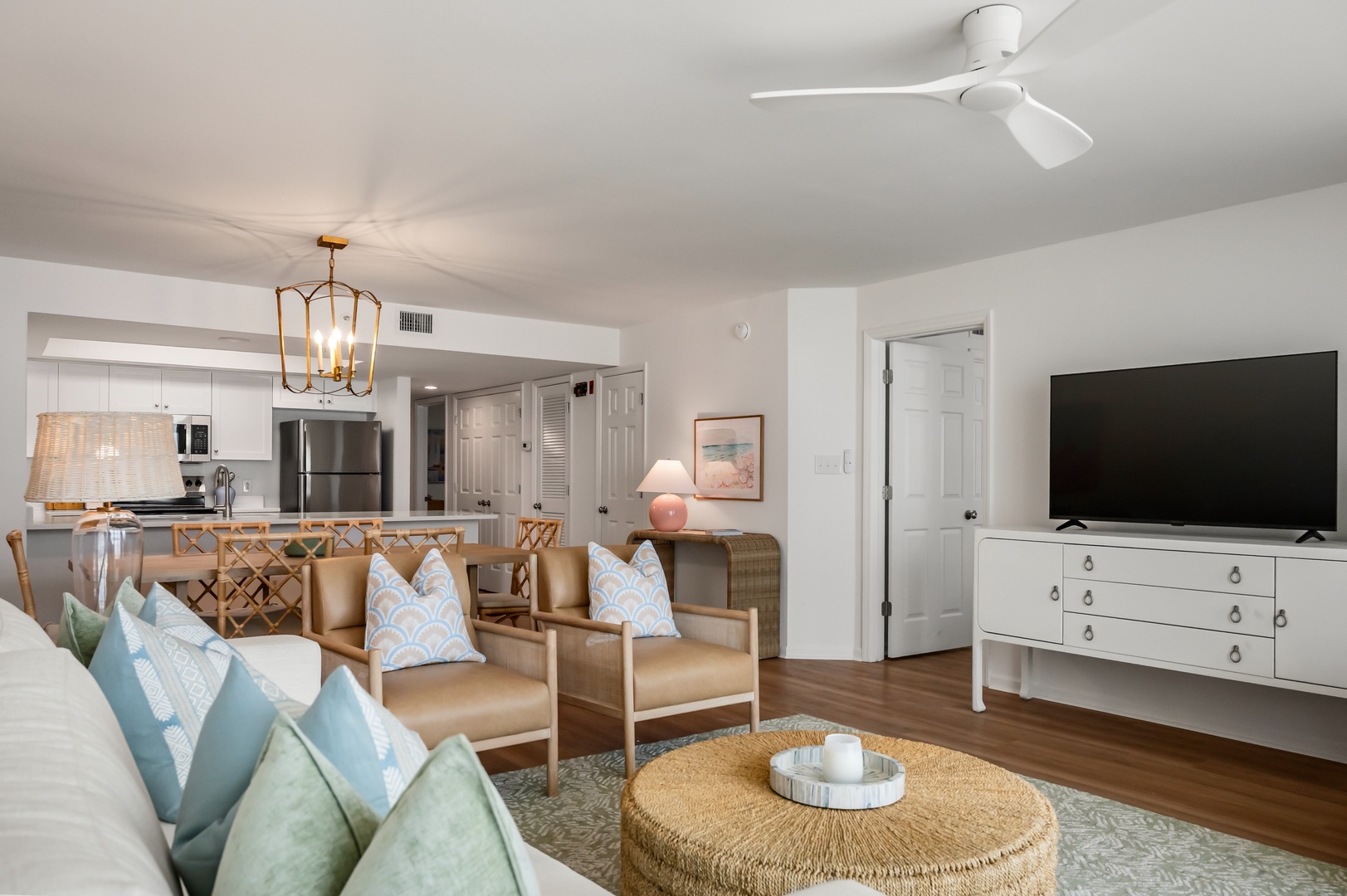 Sink into soft seating with calming coastal colors, where your open living space flows seamlessly into a fully equipped kitchen for effortless entertaining.