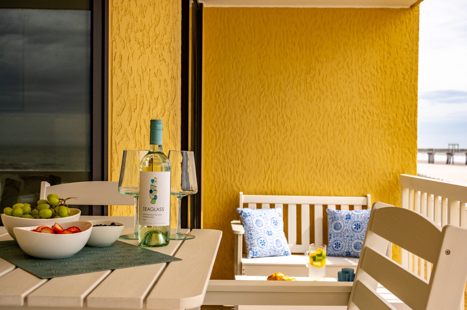 Sip wine while enjoying fresh fruit on your private balcony with charming white furniture and coastal views.