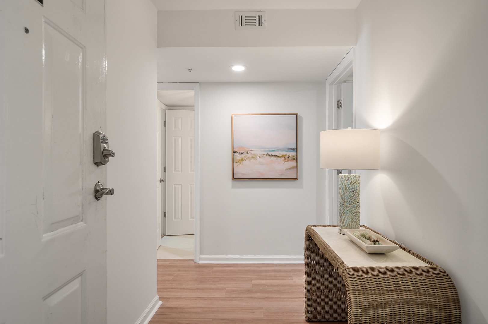 Step into your bright, welcoming entryway with warm wood floors and coastal artwork that sets a relaxing tone for your stay.
