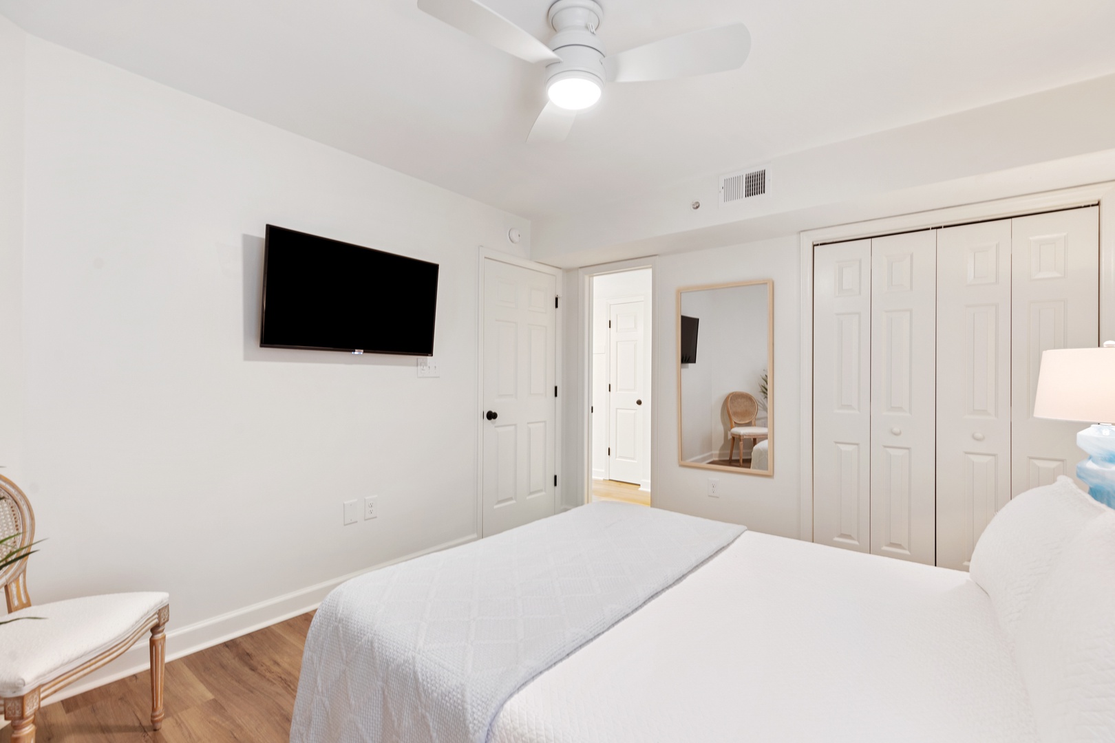 Bedroom #3: Queen bed with shared bathroom access and mounted TV.
