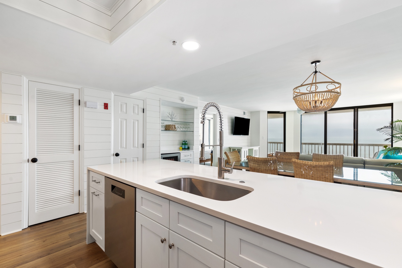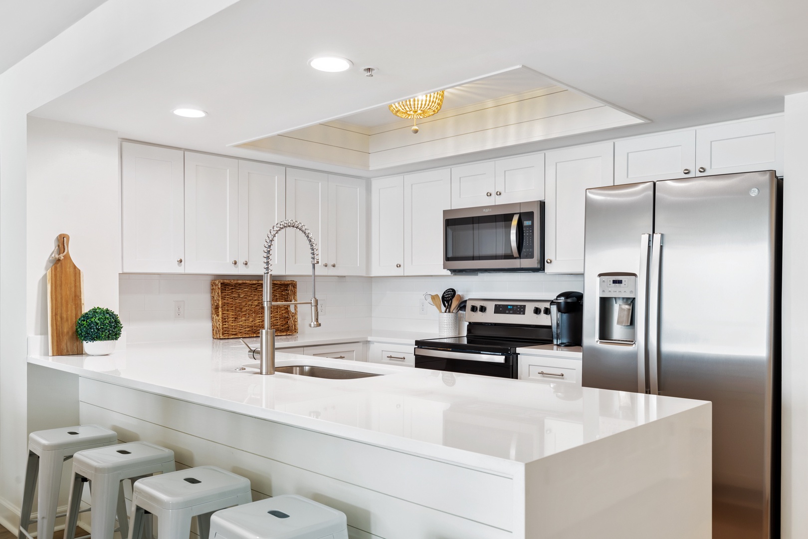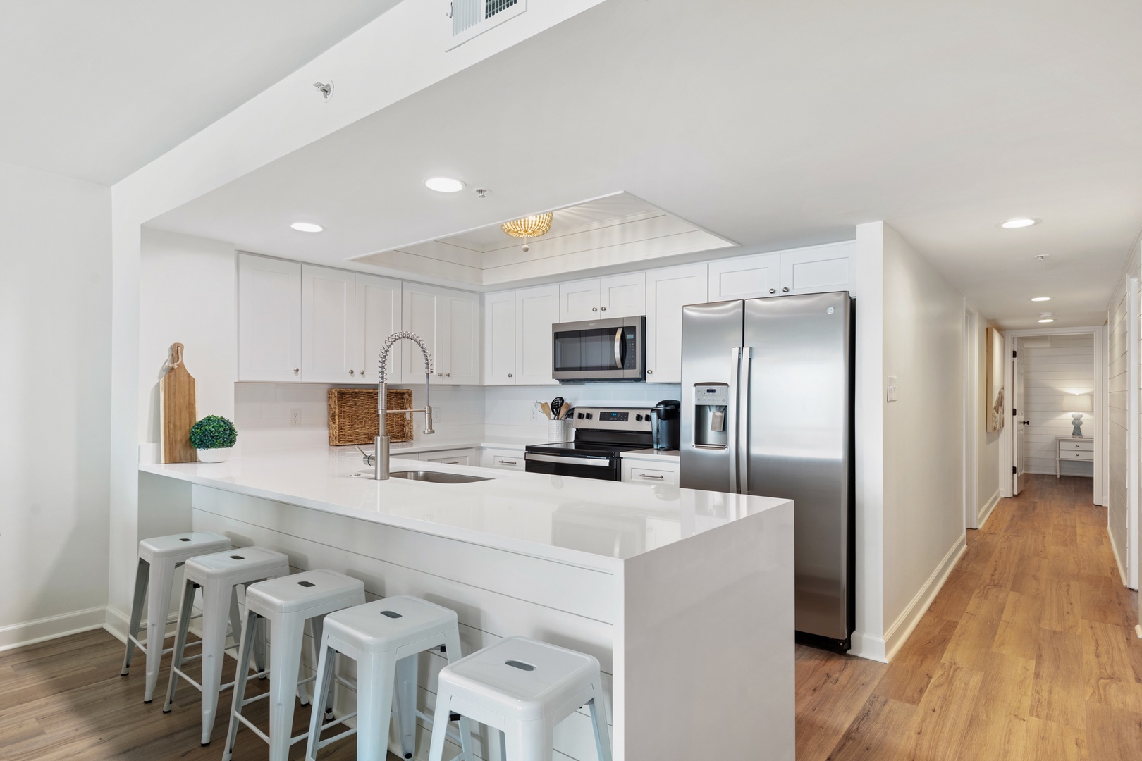 The fully stocked kitchen includes modern appliances, including a refrigerator, oven, microwave, and dishwasher. The kitchen is well-equipped to prepare beachside snacks and meals, and it features both a Keurig and drip coffee maker to cater to all coffee lovers.