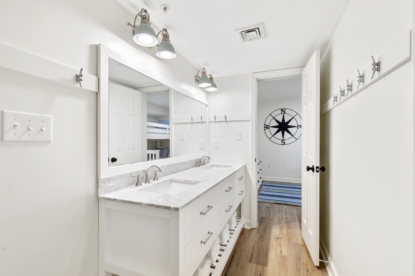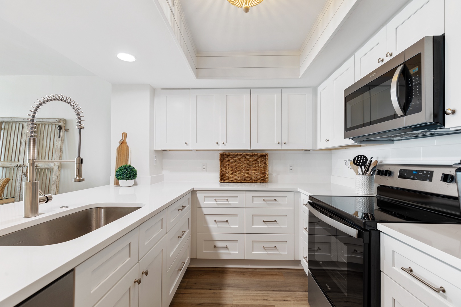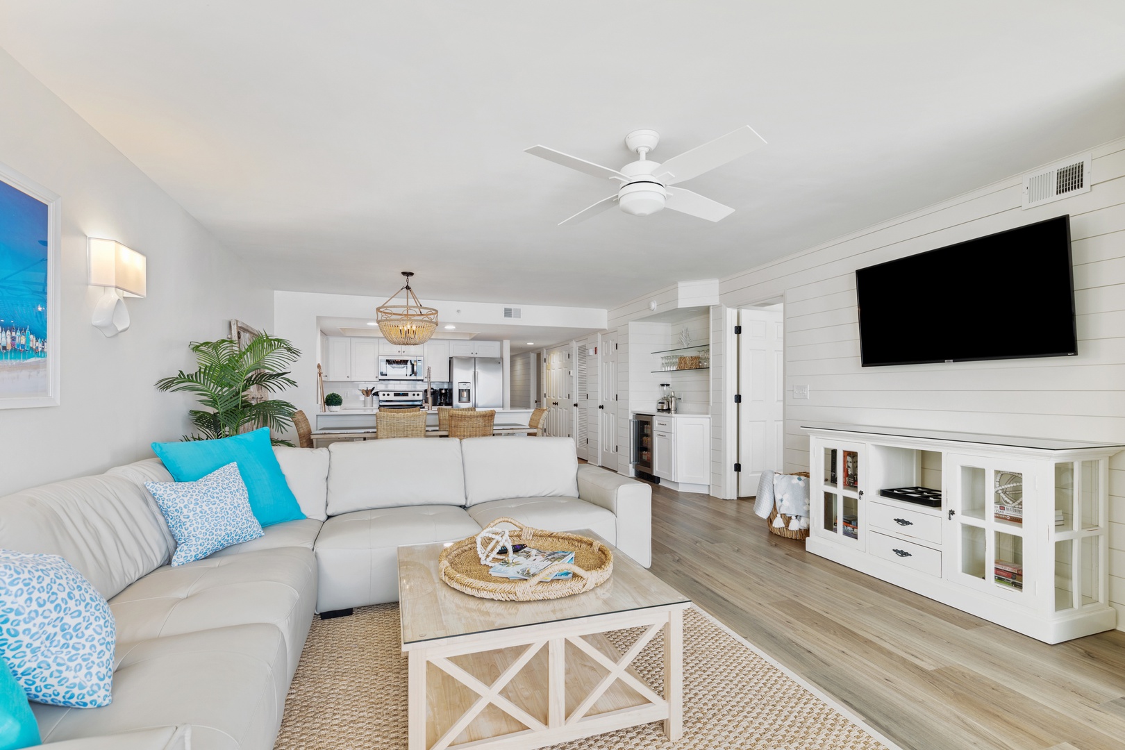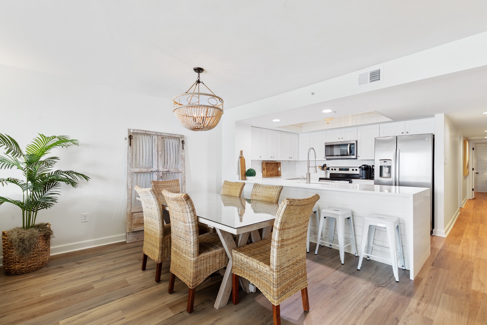 The fully stocked kitchen includes modern appliances, including a refrigerator, oven, microwave, and dishwasher. The kitchen is well-equipped to prepare beachside snacks and meals, and it features both a Keurig and drip coffee maker to cater to all coffee lovers.