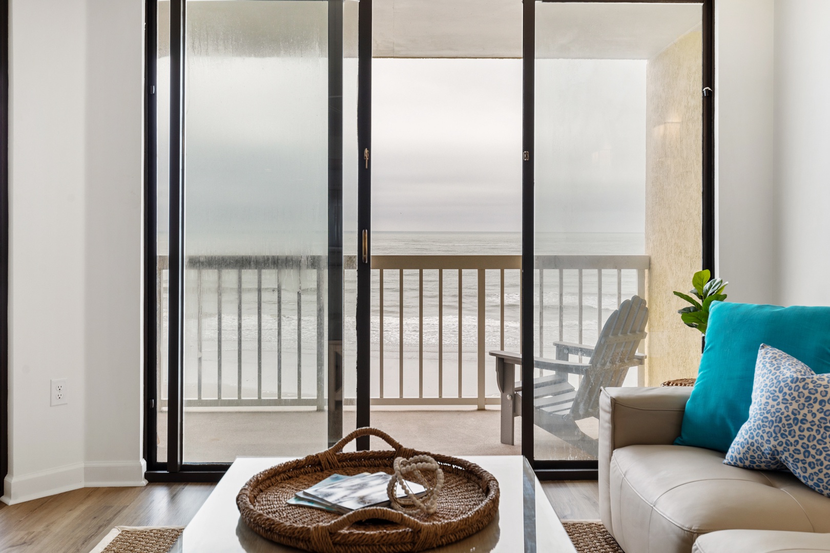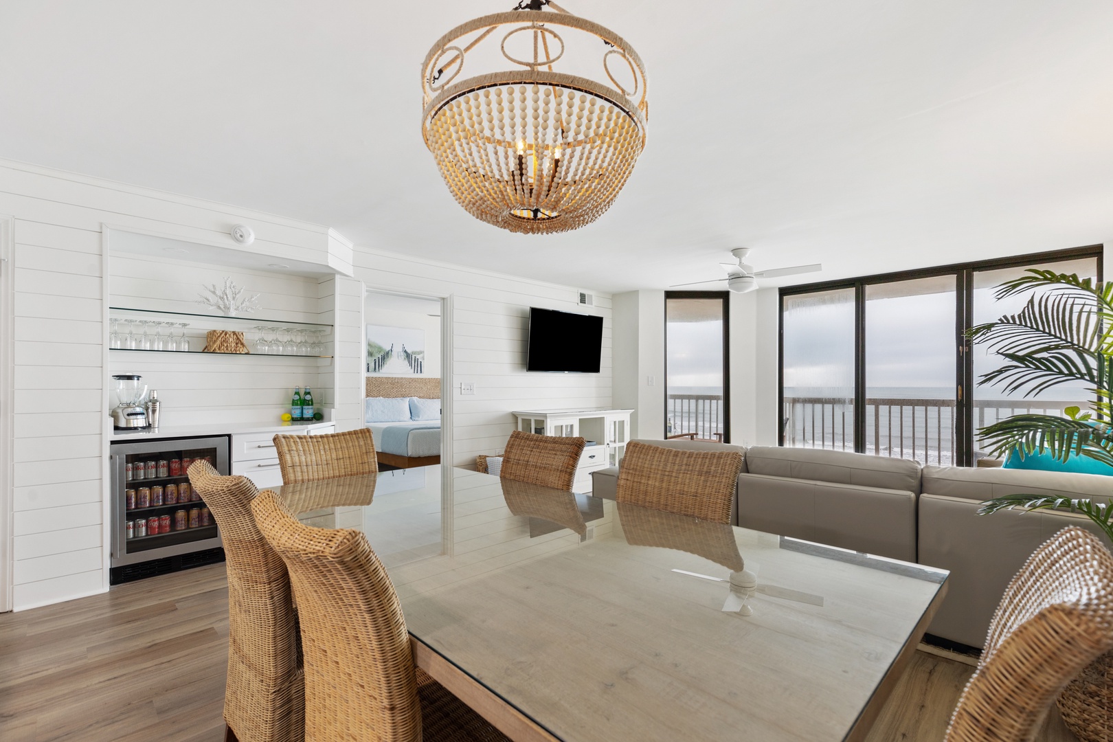 The cozy living room features comfortable seating, warm décor, and large sliding doors that lead to the oceanfront deck. The custom dry bar is perfect for mixing up drinks to enjoy on the deck while soaking in the panoramic beach views.