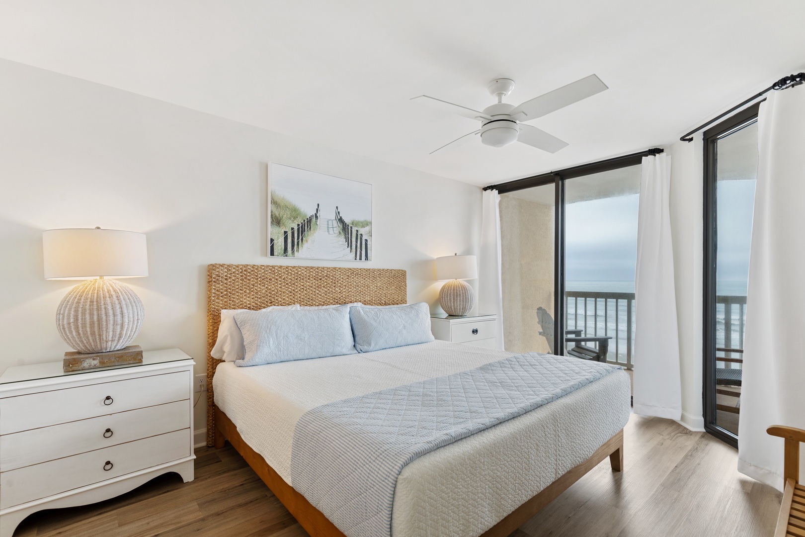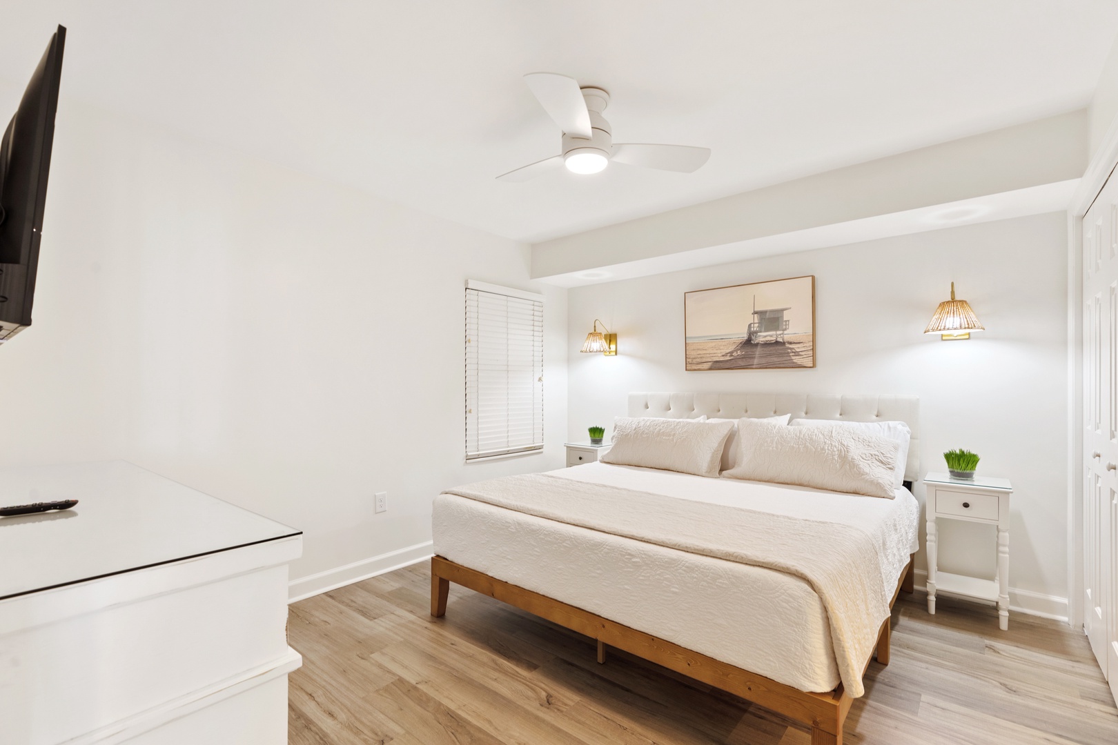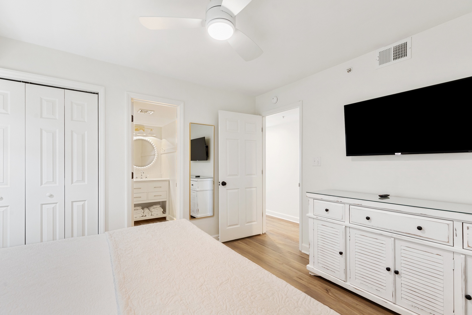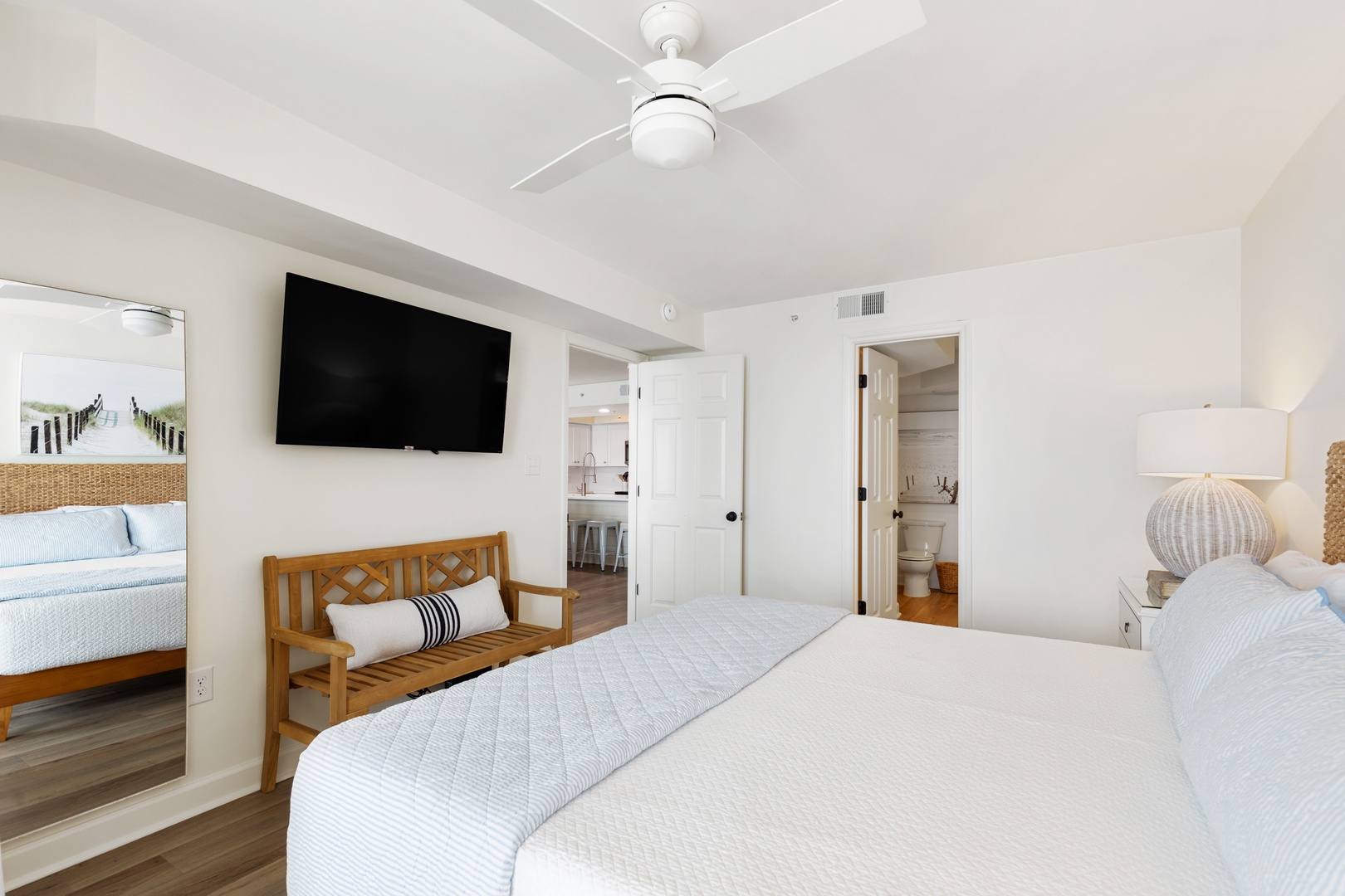 Primary Bedroom: King bed with a private en-suite bathroom, direct access to the oceanfront deck, and a mounted TV.