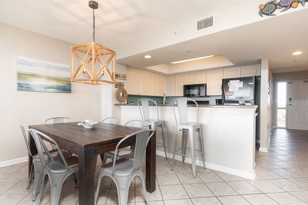 The fully equipped kitchen includes modern appliances, ample counter space, and everything you need to prepare meals for your family or group. The open layout connects the kitchen to the dining and living areas, making it easy to entertain while cooking.