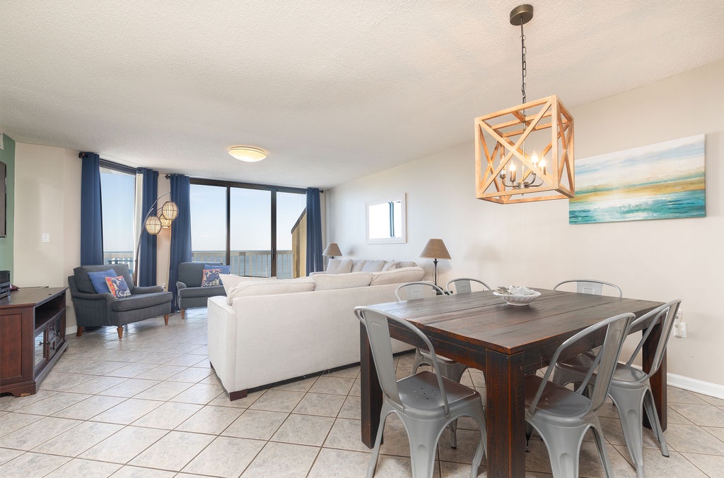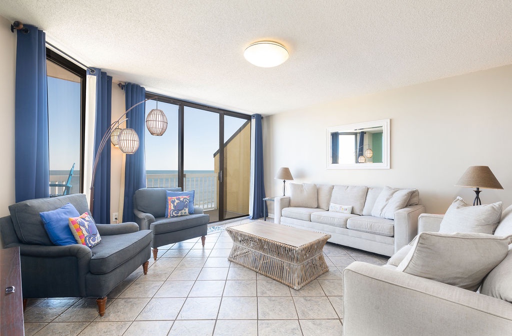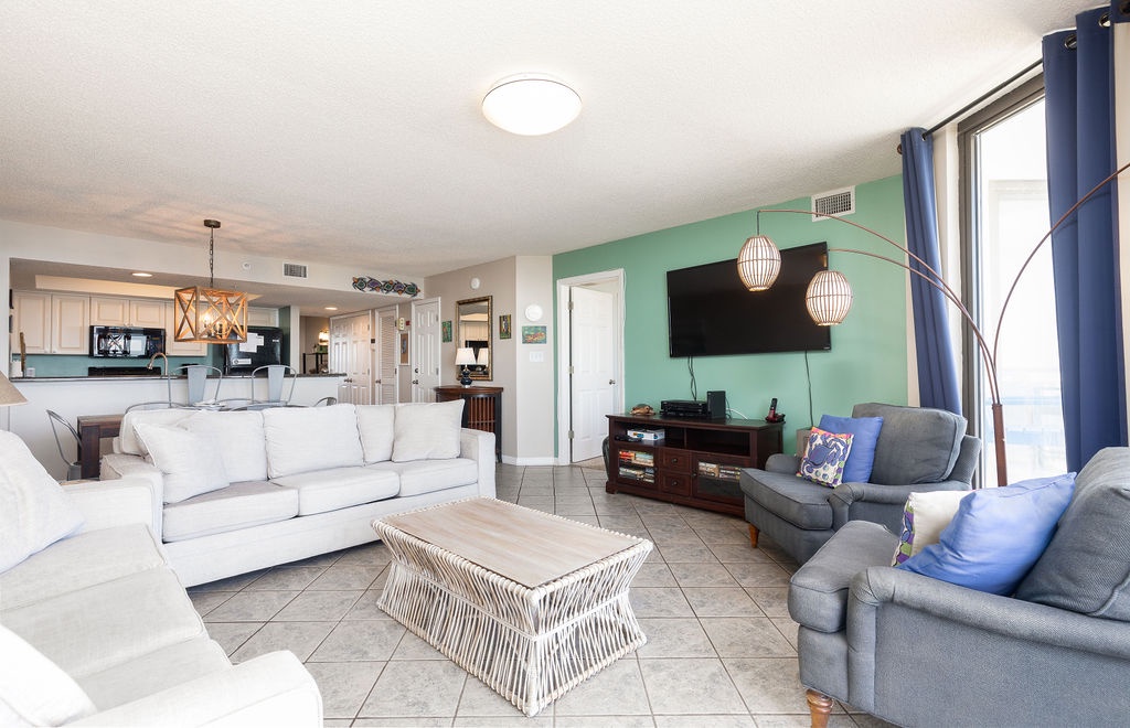 The spacious living room features comfortable seating and a 60" HDTV, perfect for movie nights after a day at the beach. Large windows provide ocean views, and sliding glass doors lead to the private balcony.