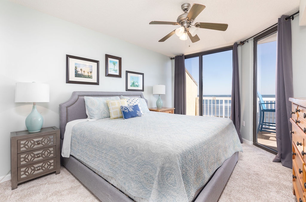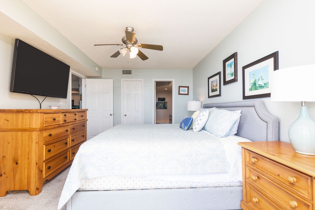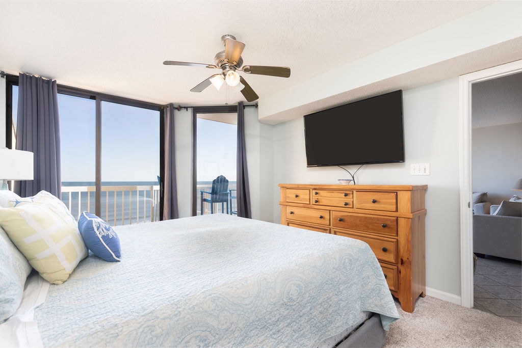 Primary Bedroom: King bed with flat-screen TV and access to the oceanfront balcony.