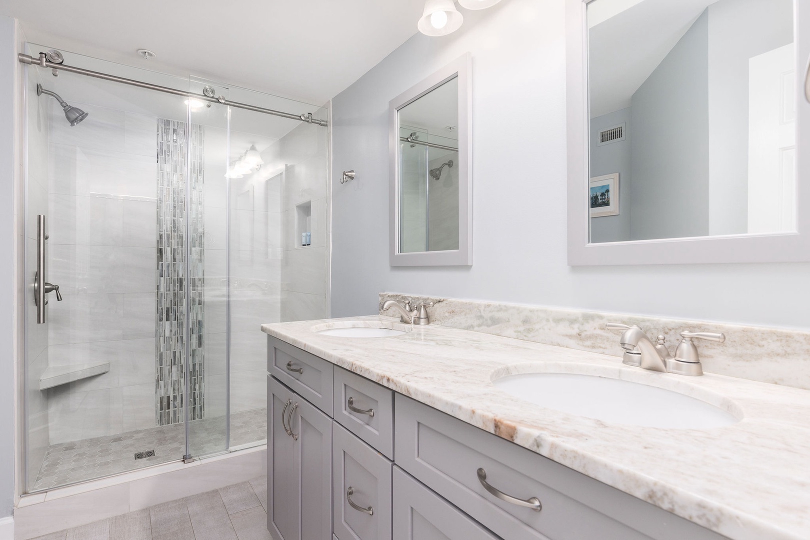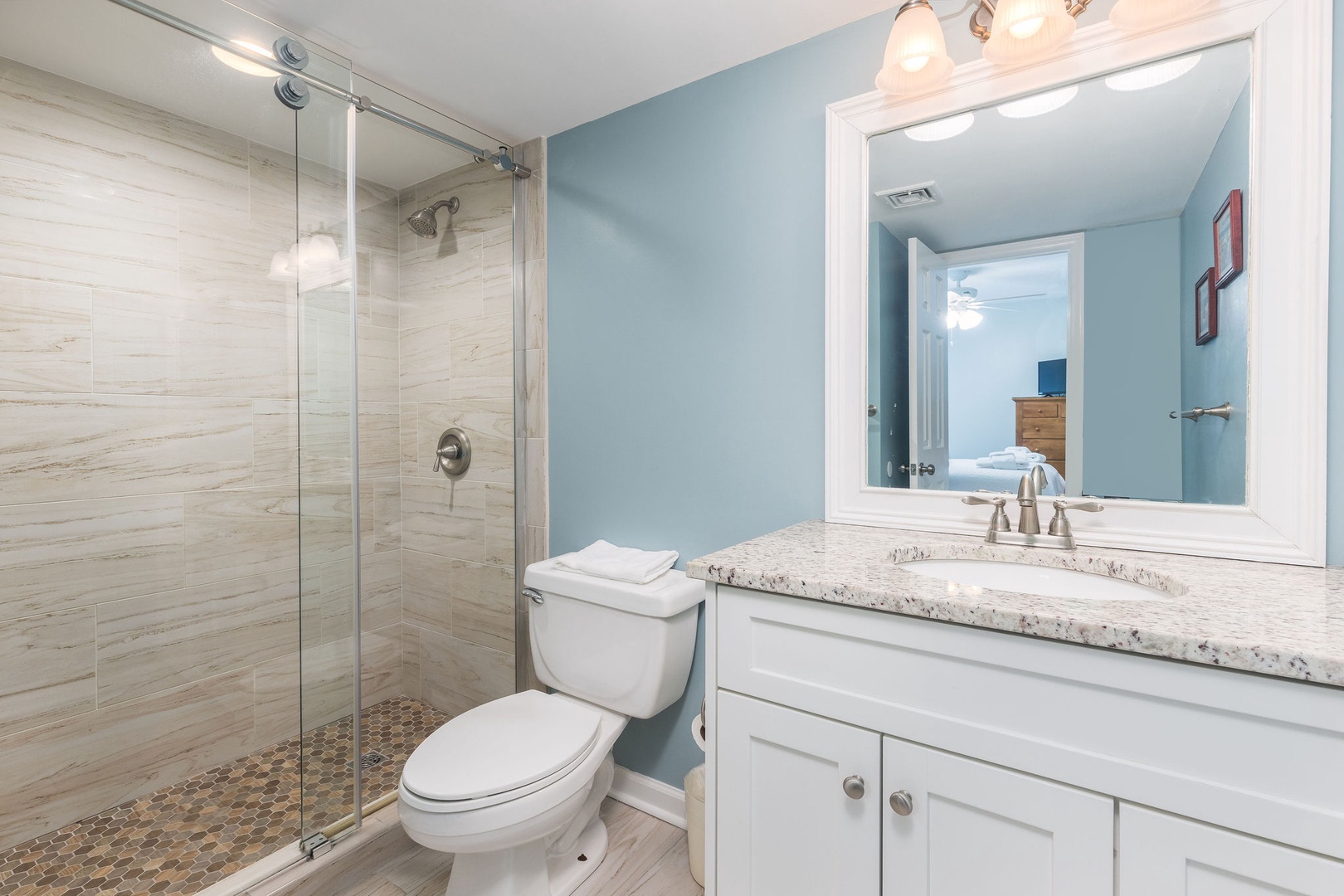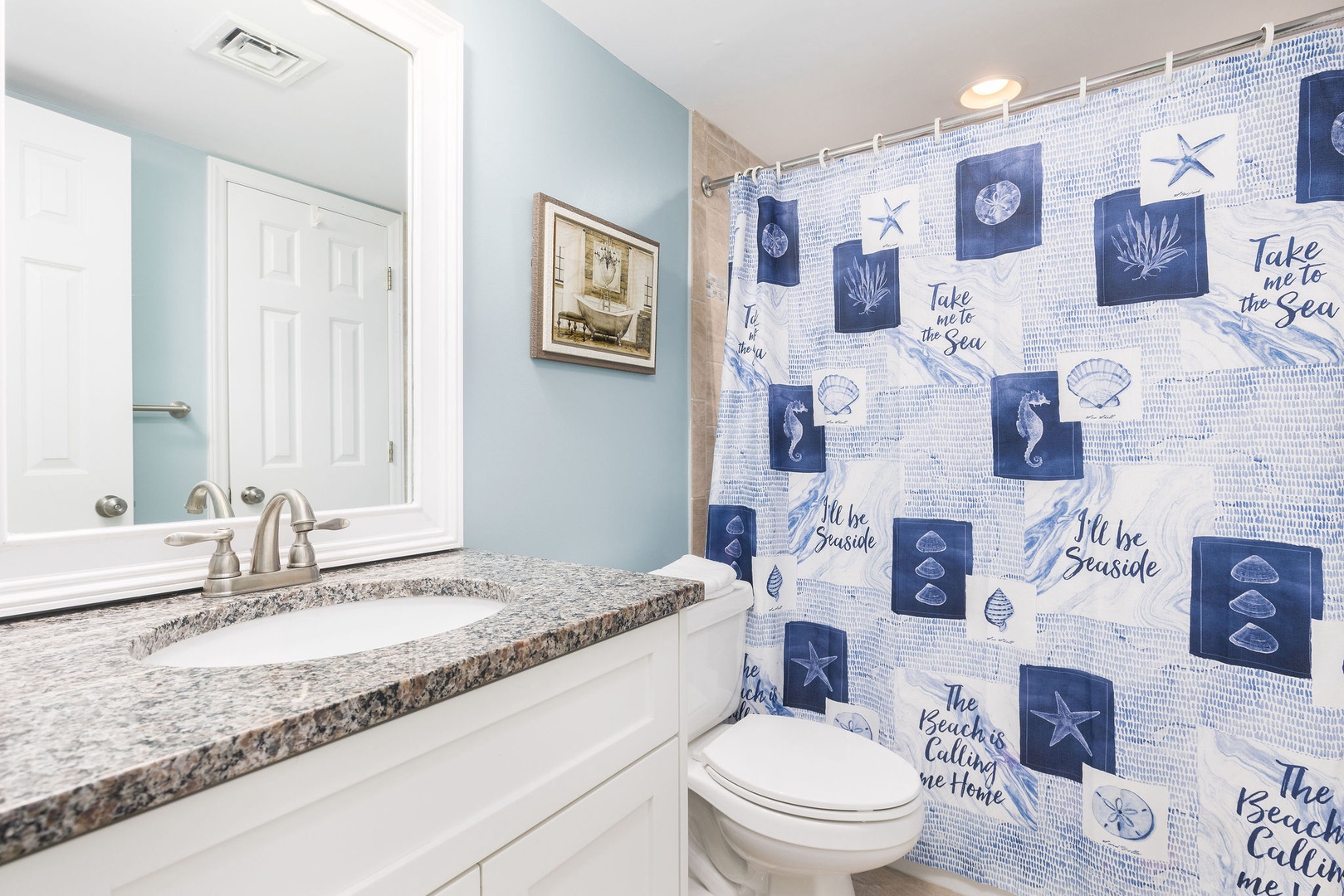 All three bathrooms are fully updated with modern fixtures, tiled showers, and fresh towels.