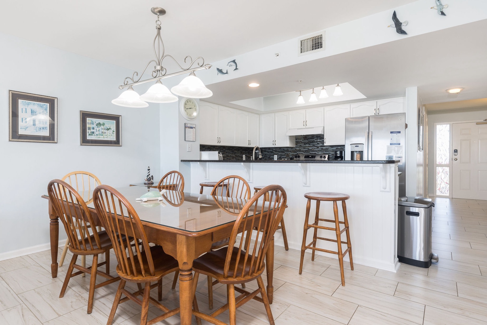 The fully equipped kitchen features modern appliances, granite countertops, and an open dining area with seating for six at the table and three additional stools at the counter, perfect for preparing and enjoying meals with family and friends.
