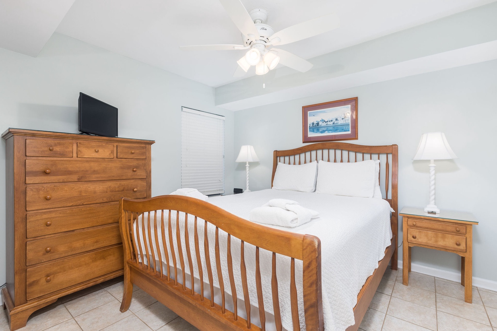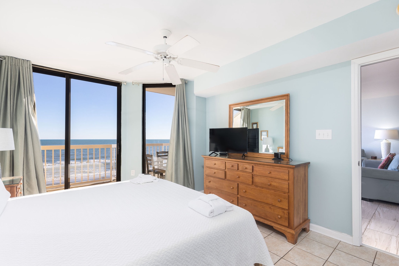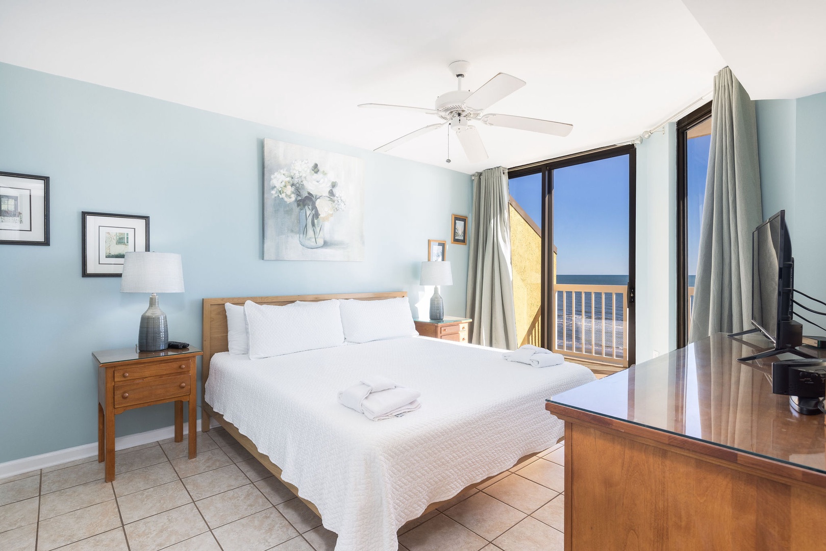 Primary Bedroom: King bed with ocean views, direct balcony access, and an en-suite bathroom with a walk-in shower.