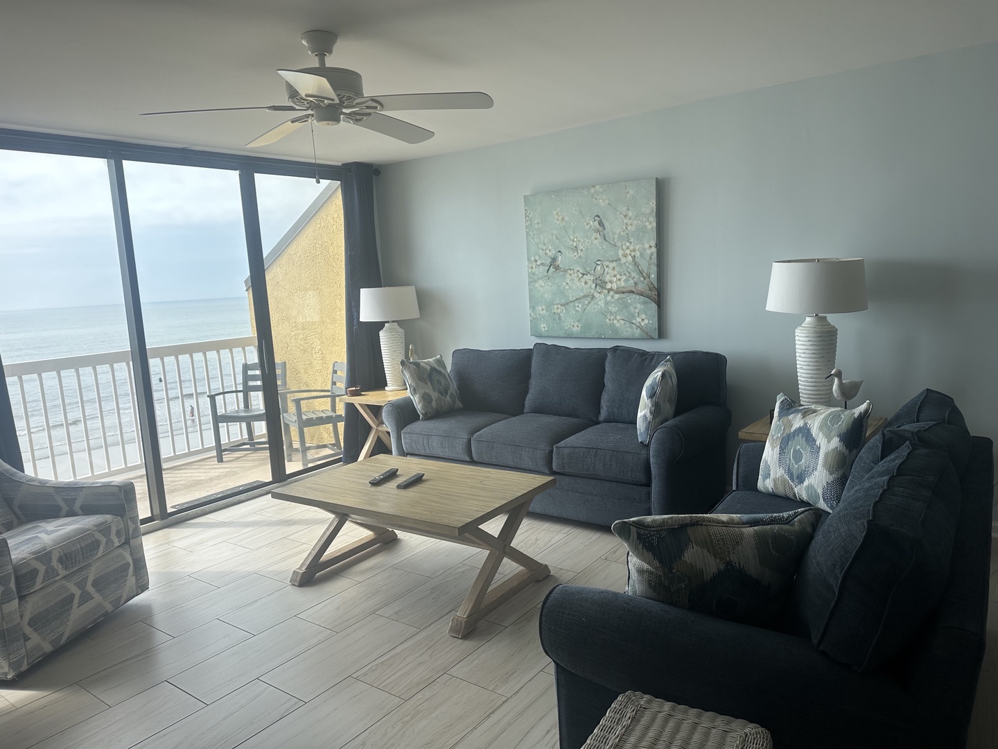 The spacious living room offers an open layout with coastal décor, providing ample seating and spectacular ocean views. Large sliding glass doors lead to the private balcony, where you can enjoy the sunrise and endless ocean views.
