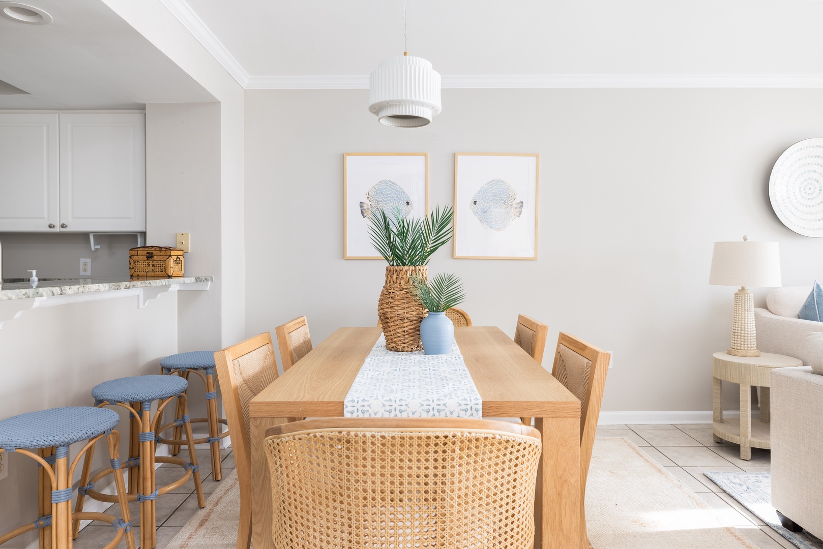 The open-concept living room, dining area, and kitchen are elegantly designed with tile flooring. Floor-to-ceiling windows in the living room provide stunning ocean views, and the living area opens to a private balcony furnished for outdoor relaxation. Enjoy the views from the comfort of the plush couches or step outside to soak up the sun.