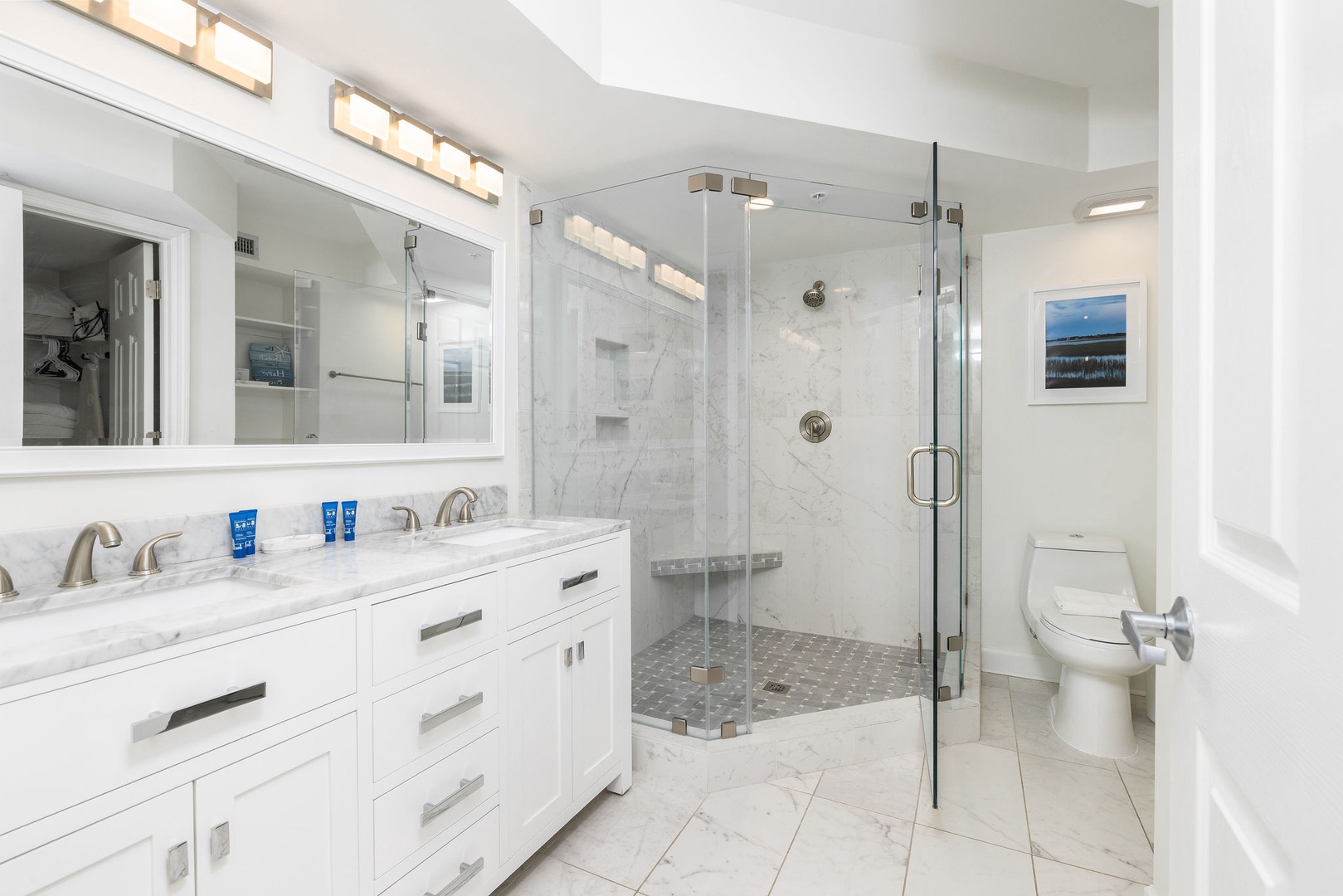 Indulge in your private spa-like retreat with dual vanities, elegant marble finishes, and a spacious glass shower.