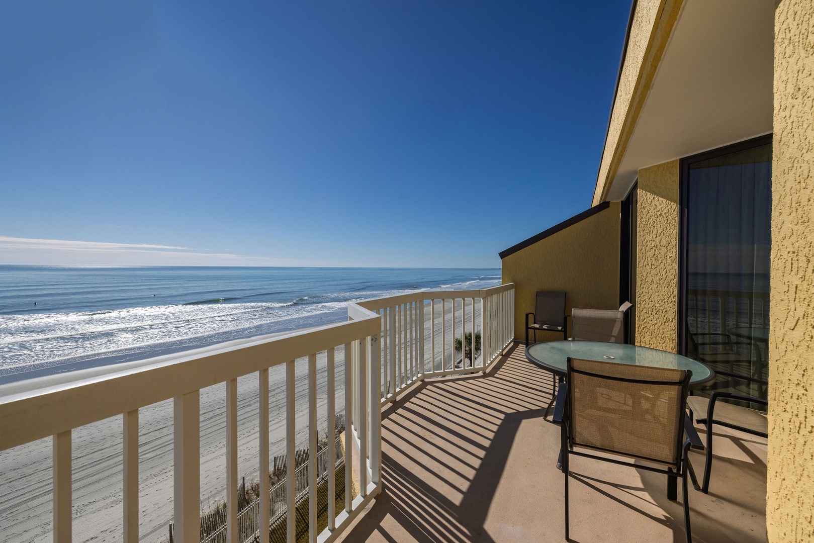Oceanfront balcony with stunning beach views and pier backdrop for perfect coastal relaxation.