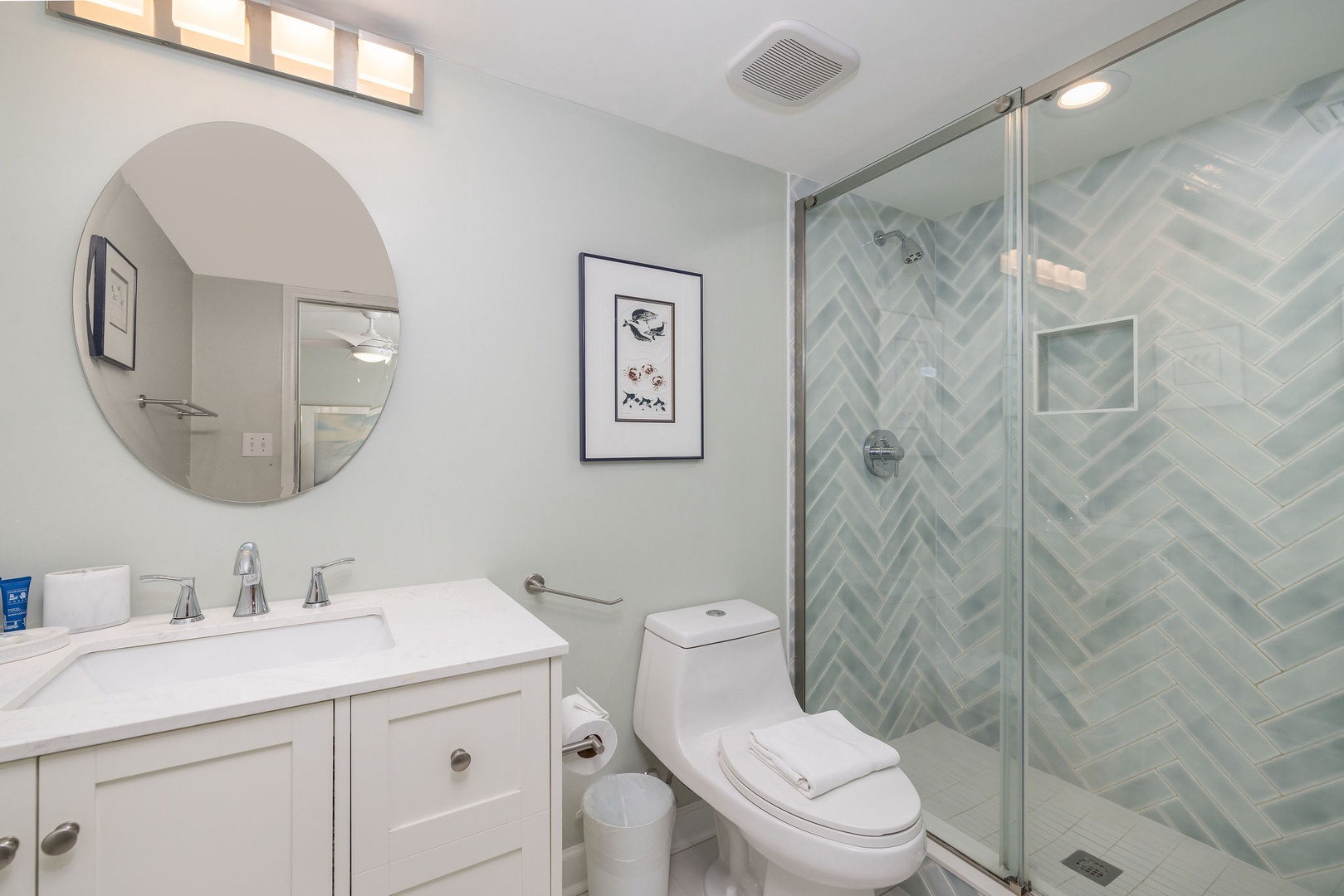 All three bathrooms have been newly remodeled to provide an elevated experience. Modern fixtures and coastal-inspired decor create a sense of relaxation and comfort. Fresh towels and complimentary toiletries are provided.