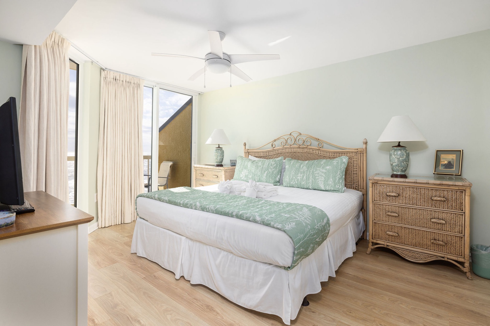 Drift off peacefully in your coastal bedroom with rattan furnishings, soothing green accents, and gentle ocean breezes from your ceiling fan.