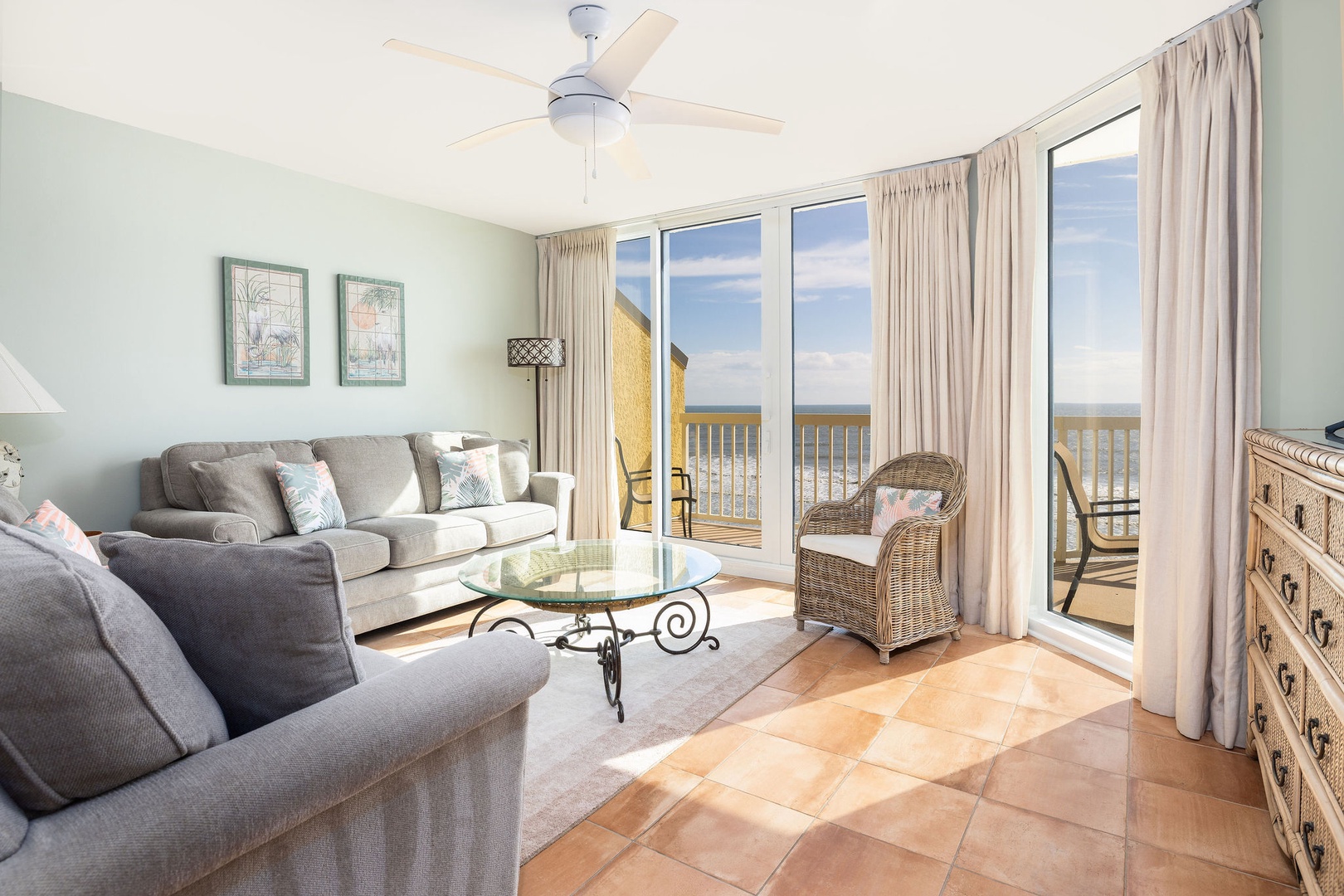 Relax in your beachfront living room with panoramic ocean views through floor-to-ceiling windows and your private balcony just steps away.
