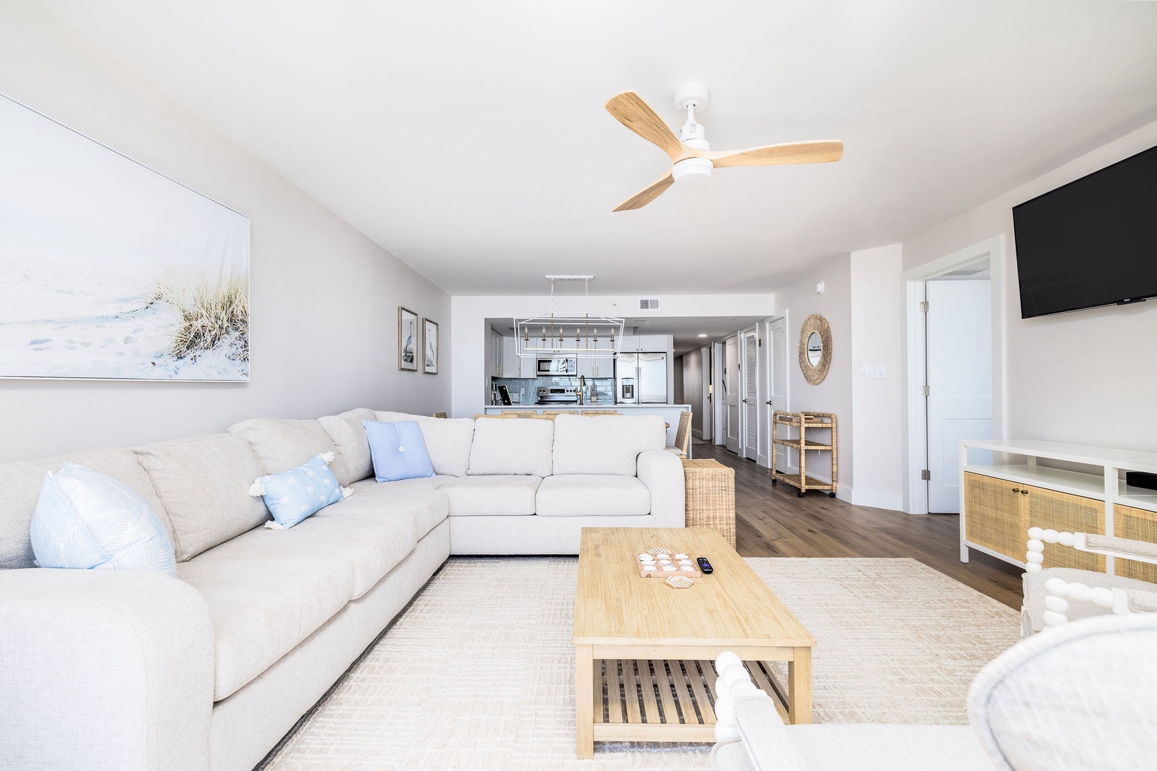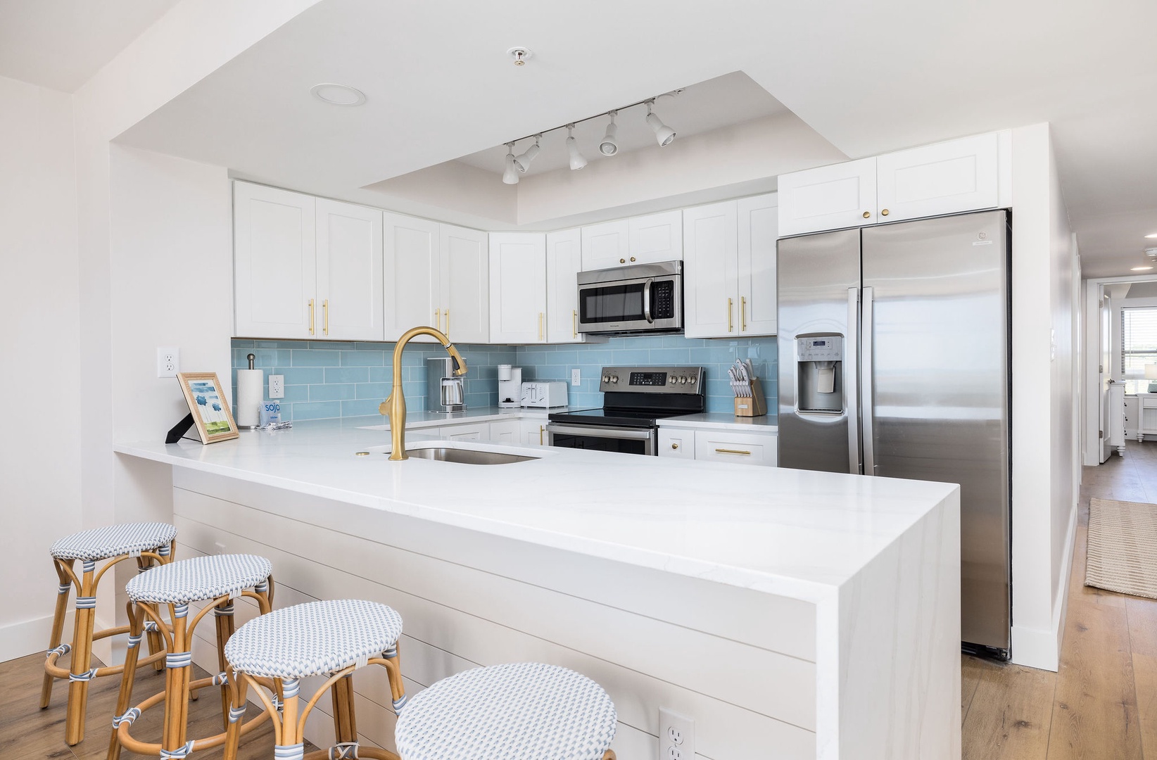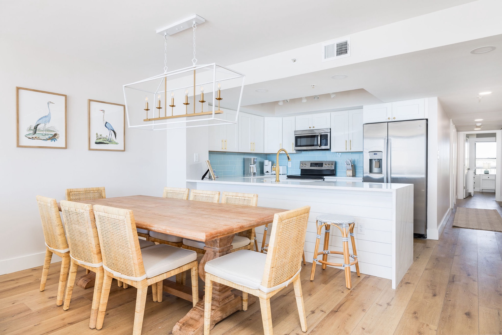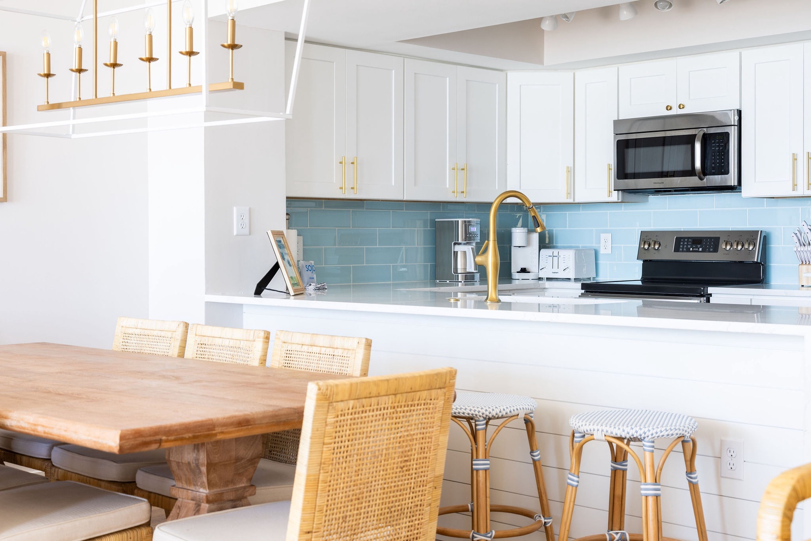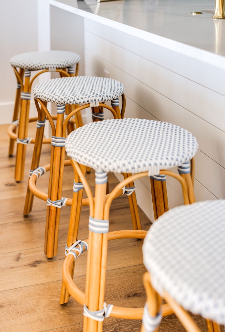 The fully equipped kitchen includes all-new appliances, flatware, glasses, and more. With ample counter space and a spacious layout, it’s perfect for preparing meals for the whole group while enjoying ocean views.
