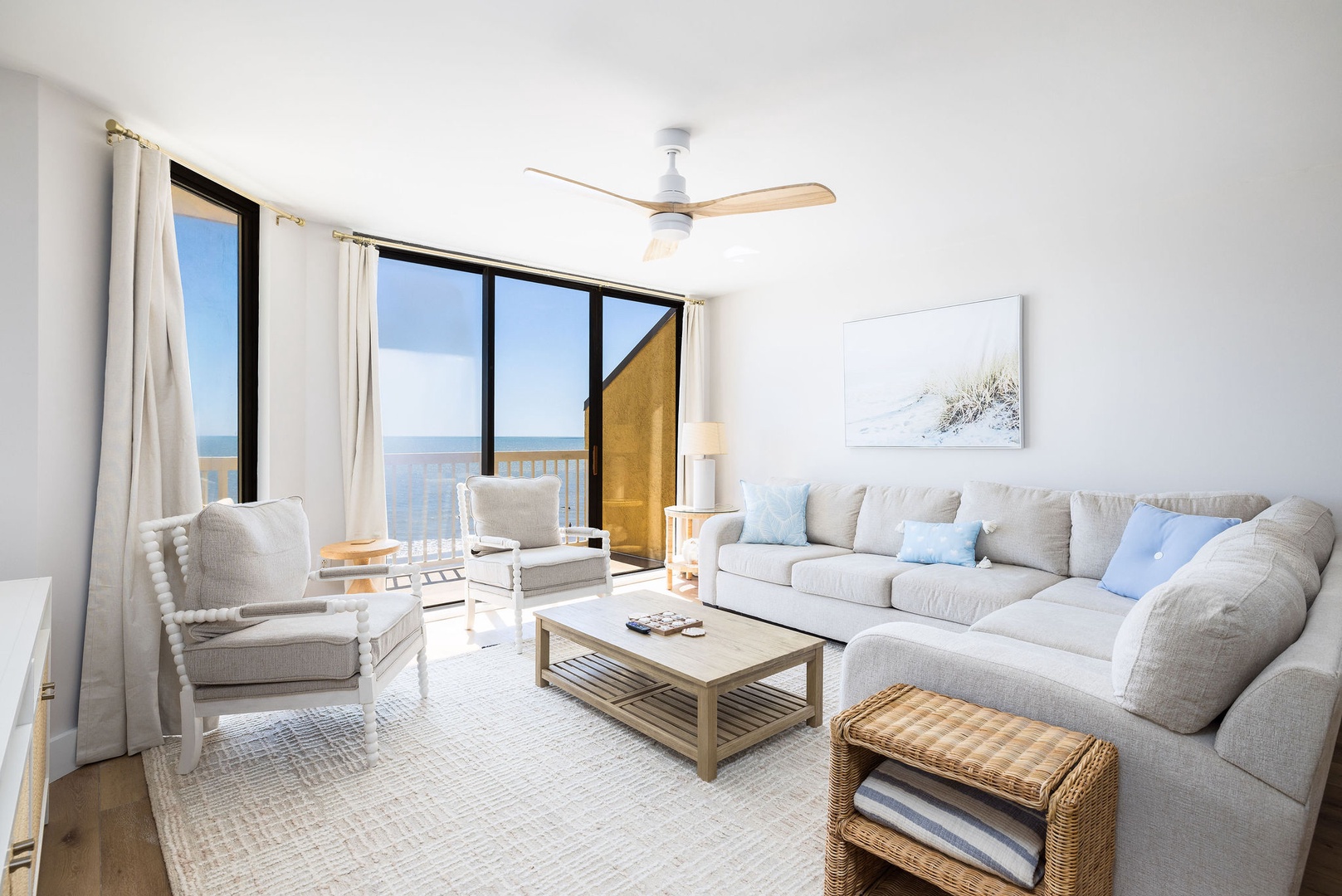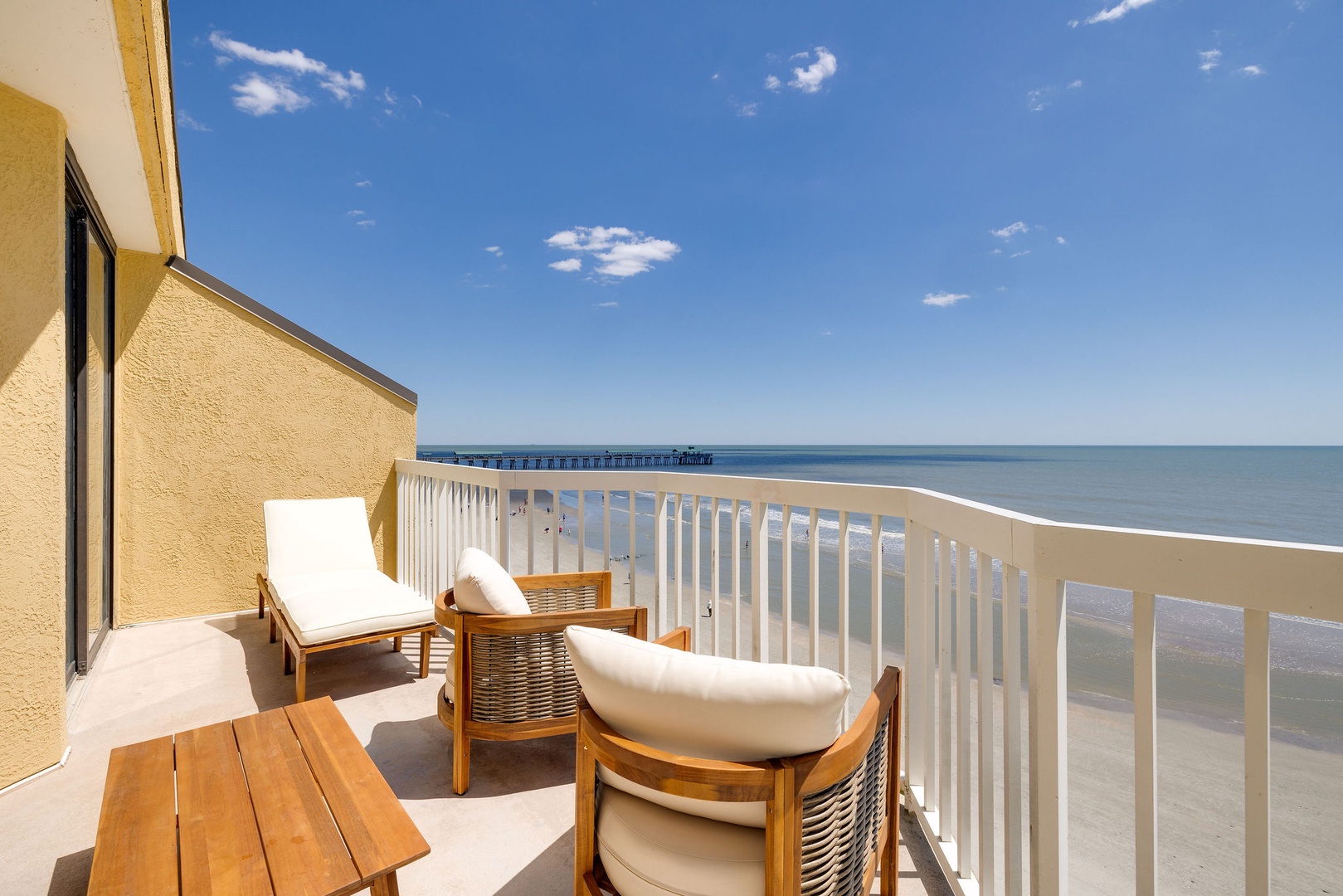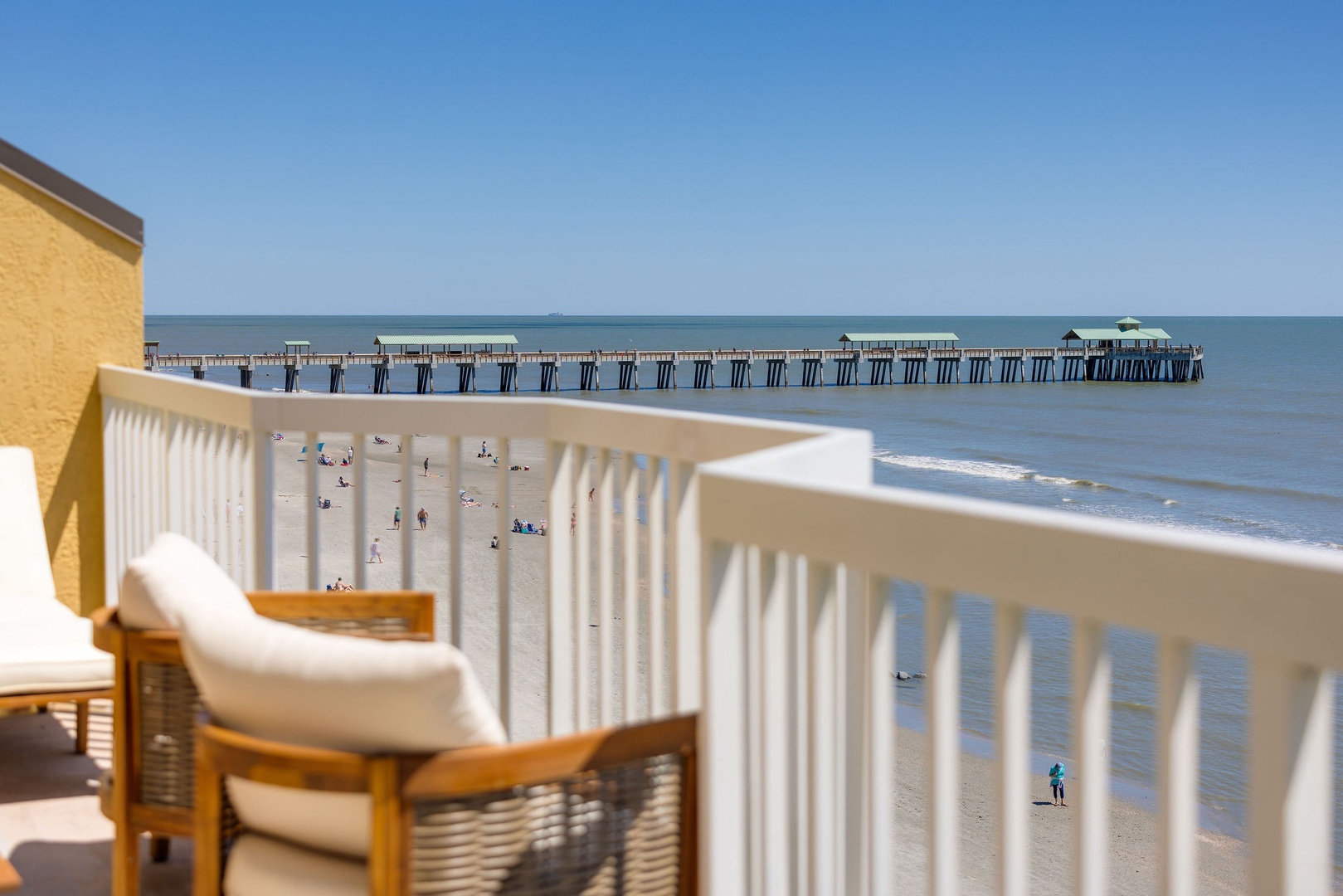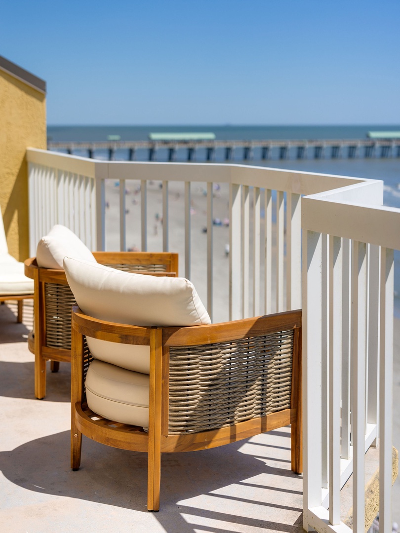 The open-concept living and dining area features floor-to-ceiling windows and sliding glass doors that provide unparalleled views of the Atlantic Ocean. Relax on the brand-new couches and enjoy the coastal-inspired decor. Step out onto the private balcony to your left to take in views of the famous Folly Beach Fishing Pier and the vast ocean beyond.