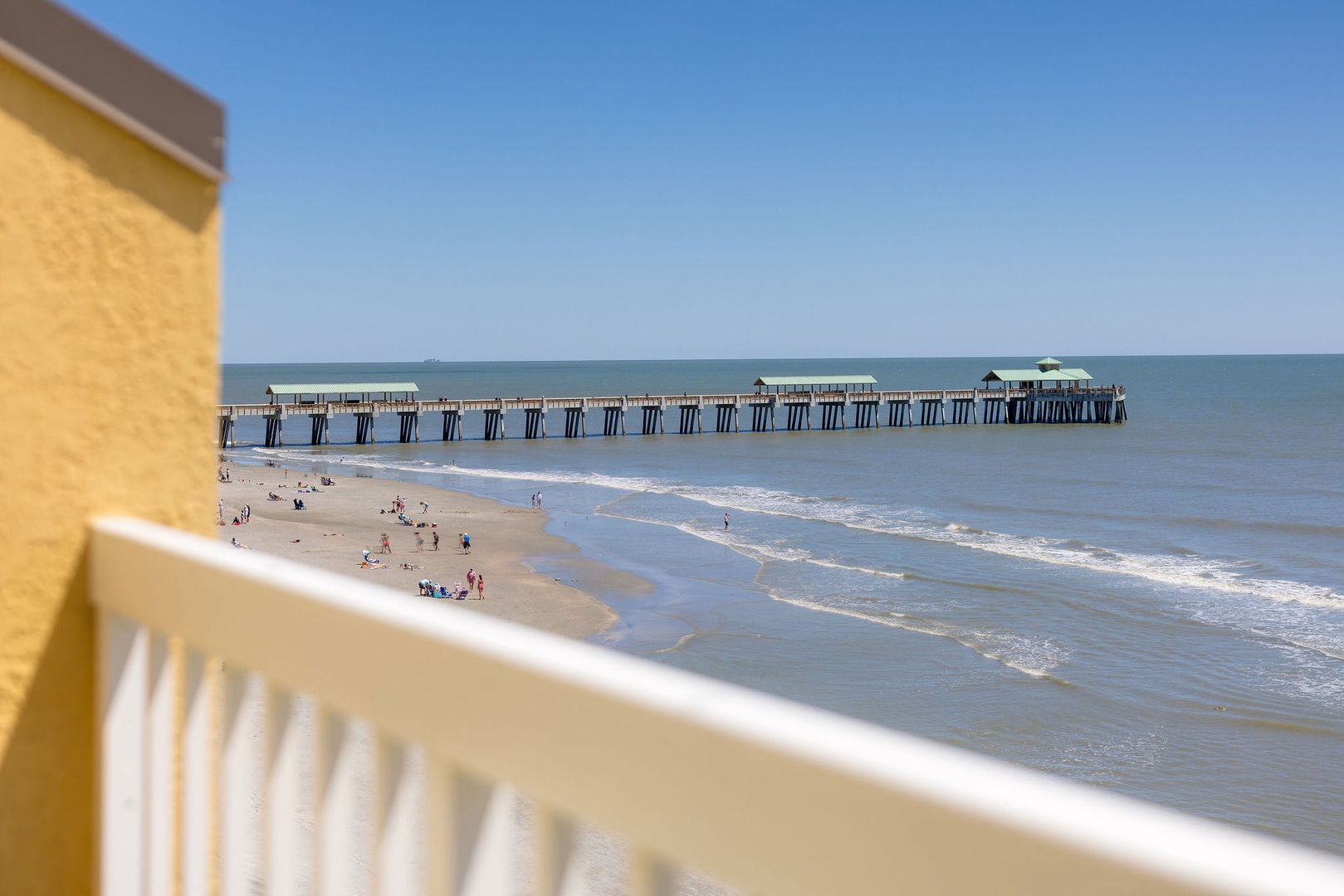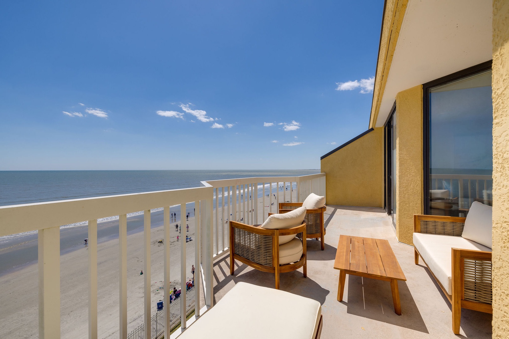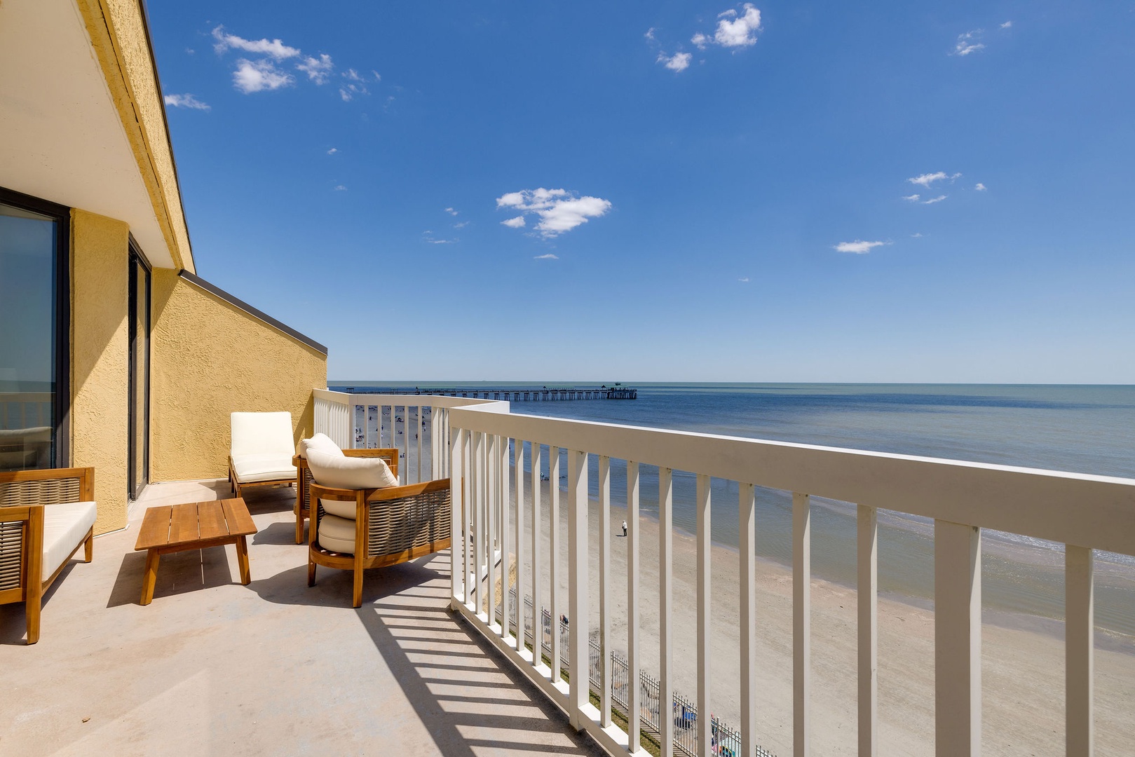 The open-concept living and dining area features floor-to-ceiling windows and sliding glass doors that provide unparalleled views of the Atlantic Ocean. Relax on the brand-new couches and enjoy the coastal-inspired decor. Step out onto the private balcony to your left to take in views of the famous Folly Beach Fishing Pier and the vast ocean beyond.