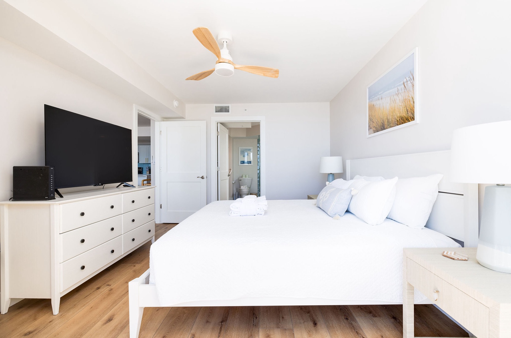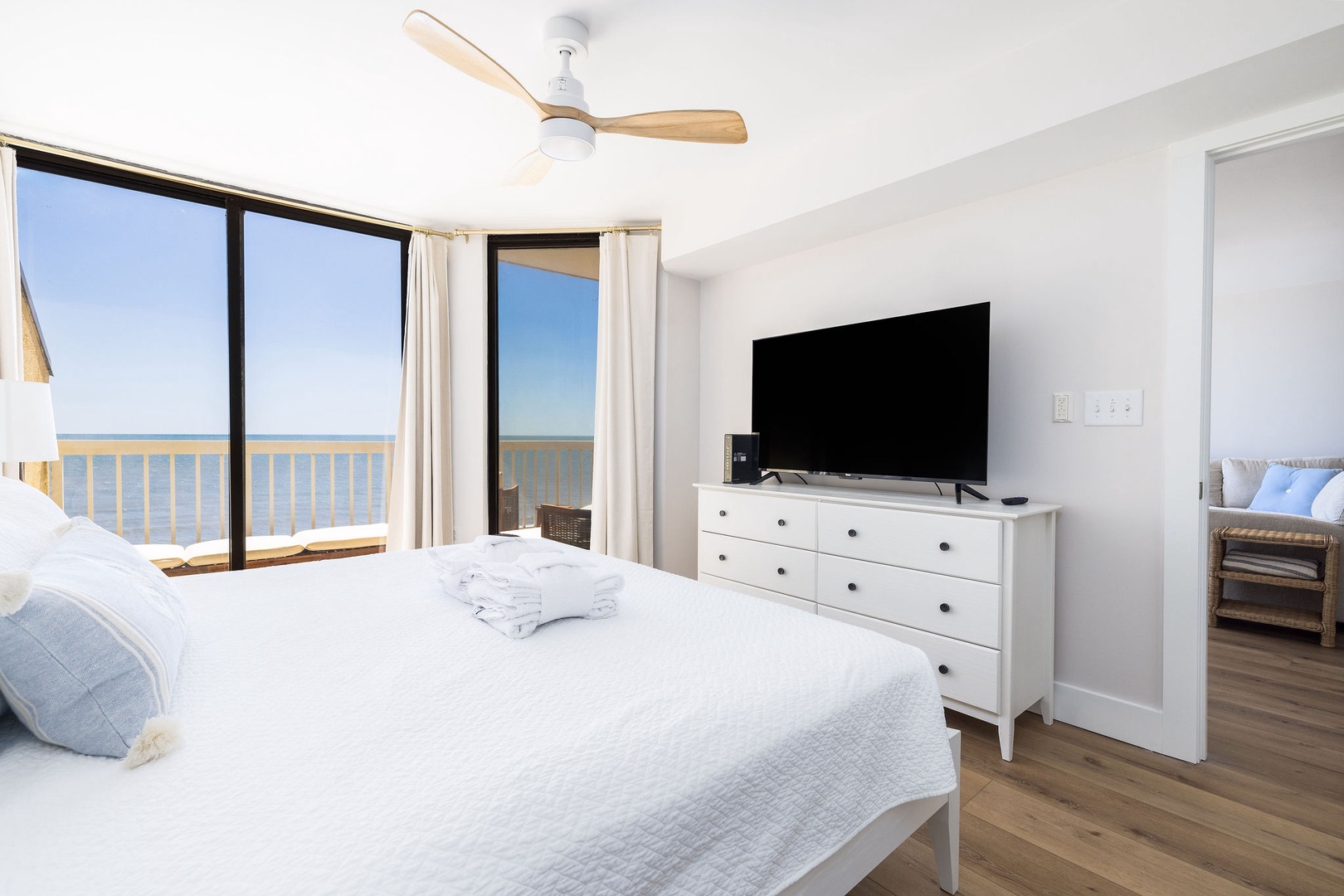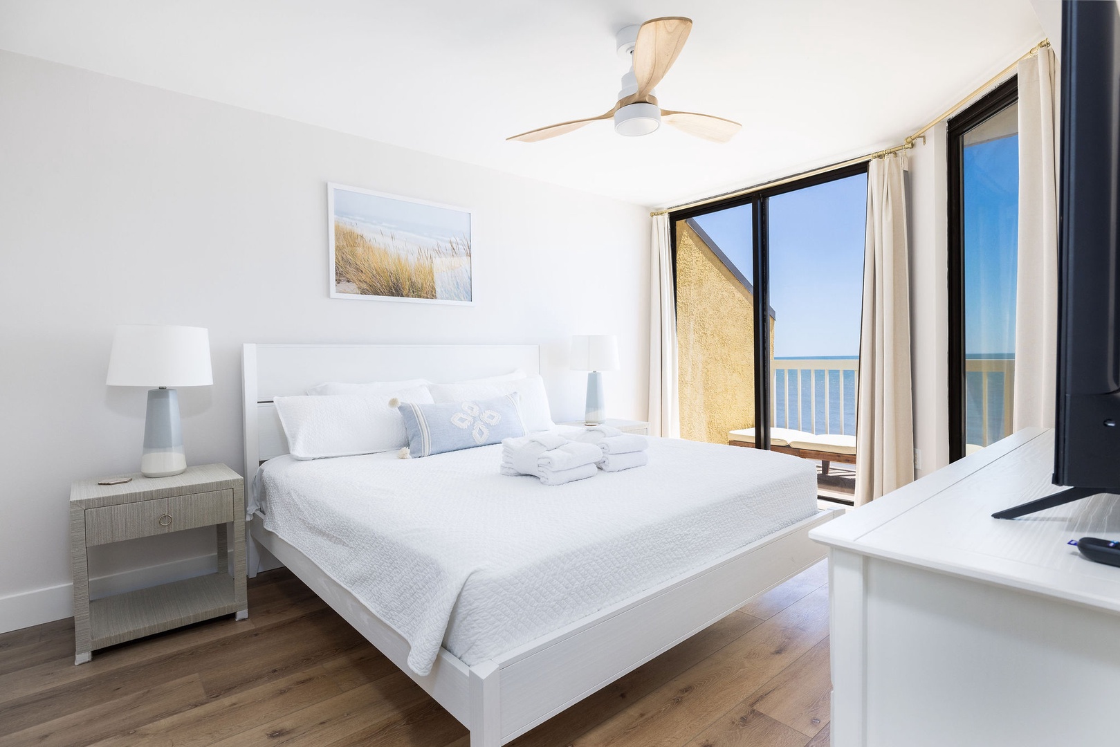 Primary Bedroom: This spacious room boasts a king-size bed, direct balcony access, and an en-suite bathroom with a newly remodeled shower and double vanity.