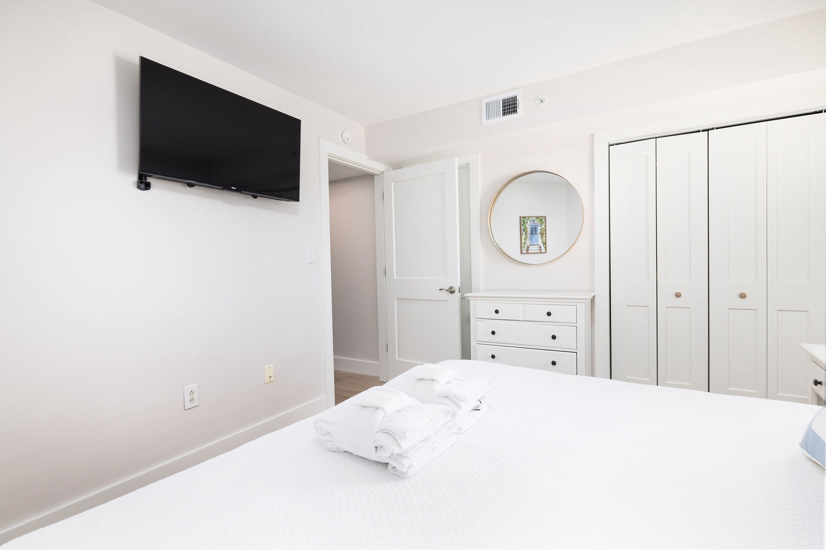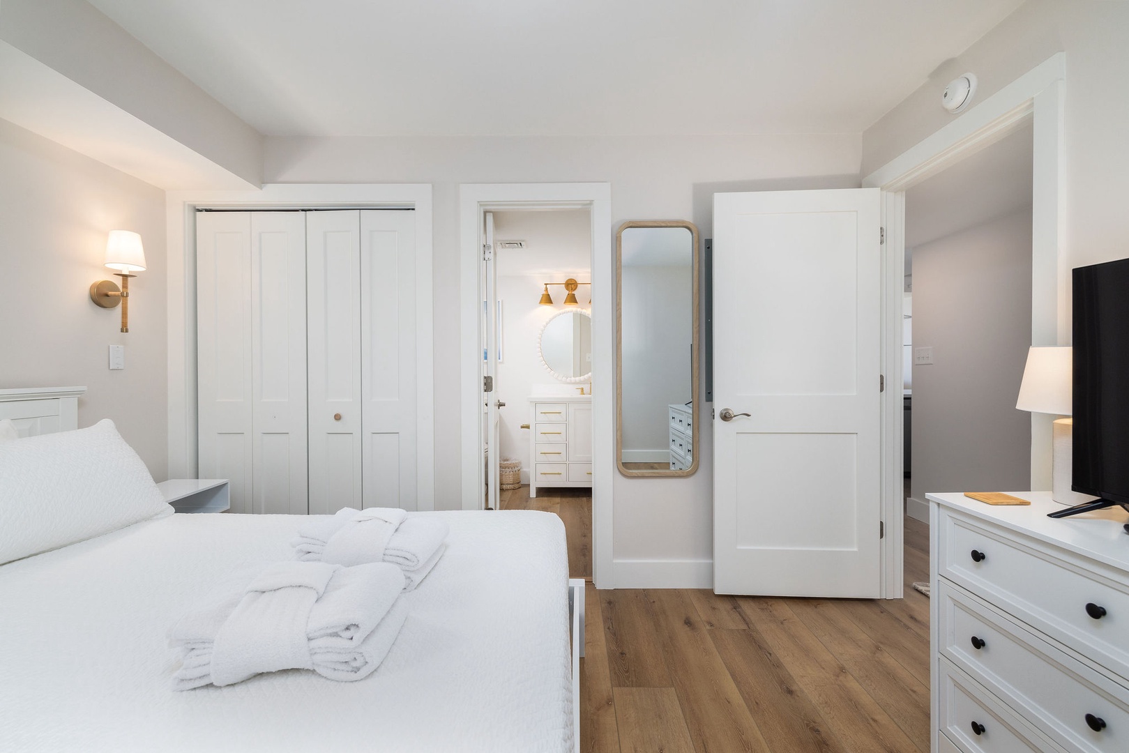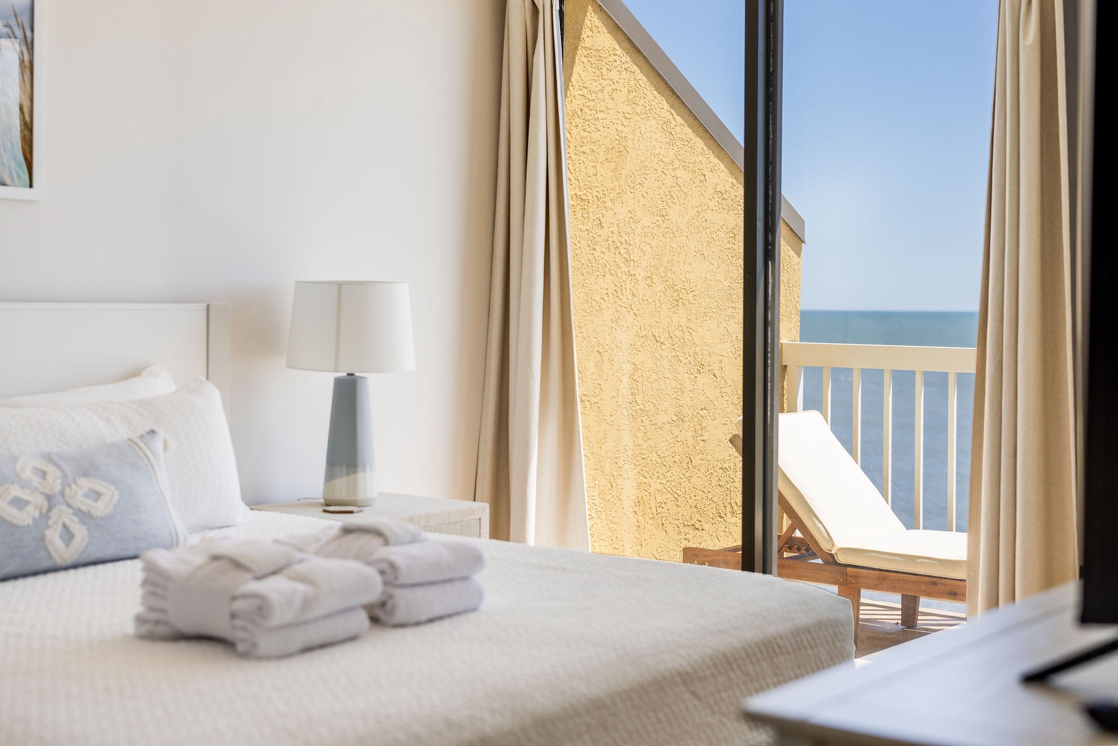 Primary Bedroom: This spacious room boasts a king-size bed, direct balcony access, and an en-suite bathroom with a newly remodeled shower and double vanity.