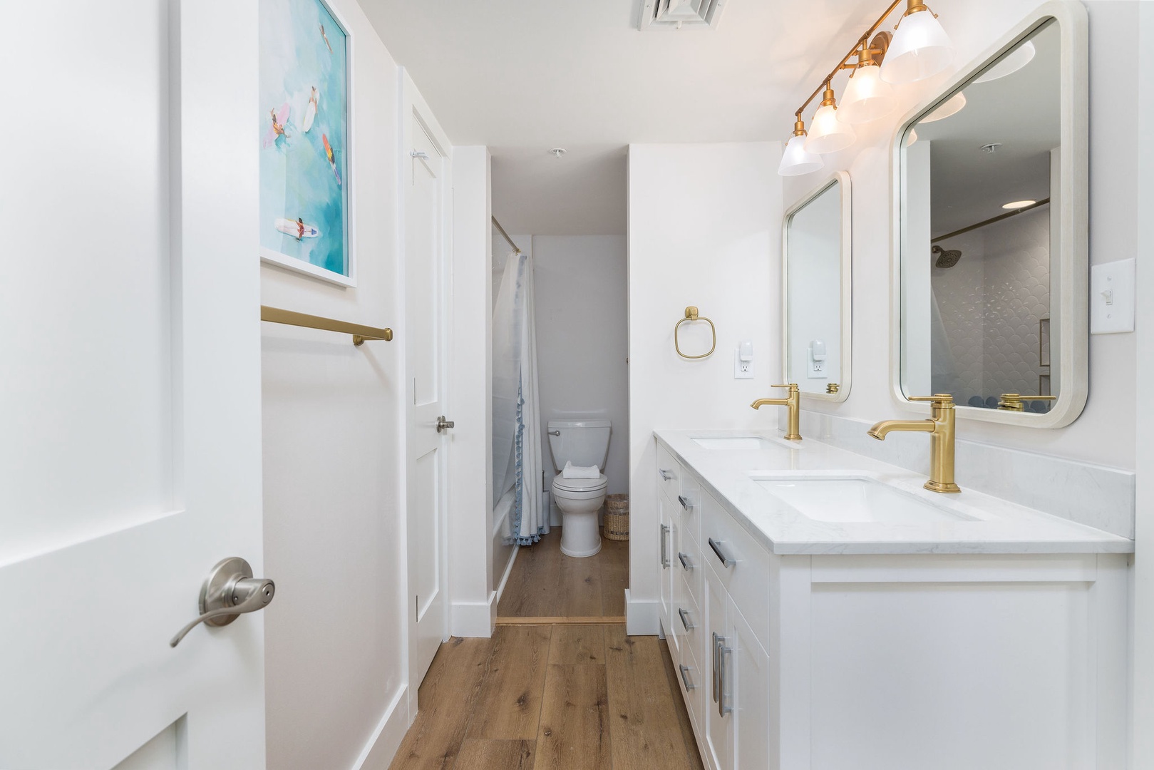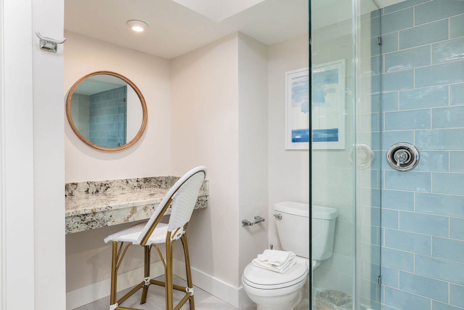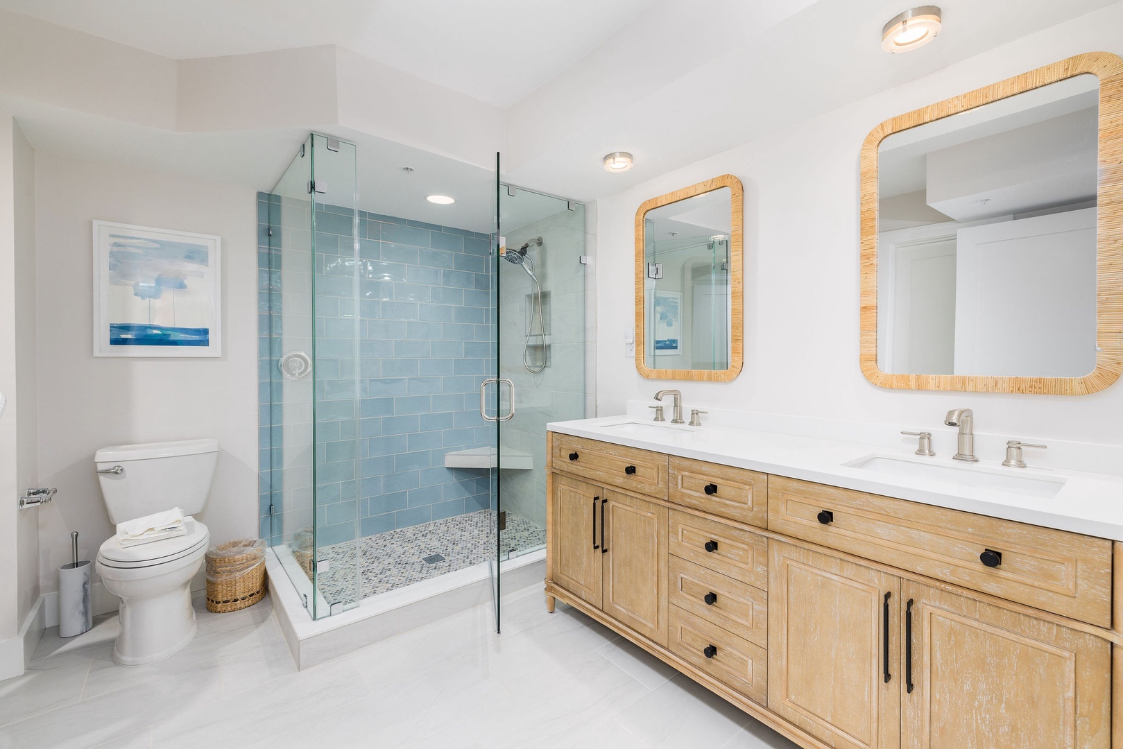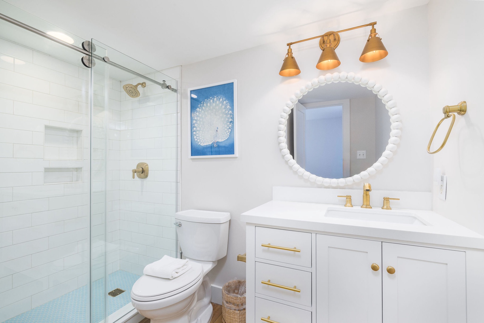 All three bathrooms have been fully remodeled with new toilets, showers, and vanities. The fresh design and coastal accents create a luxurious, spa-like experience. Fresh towels and complimentary toiletries are provided for your convenience.